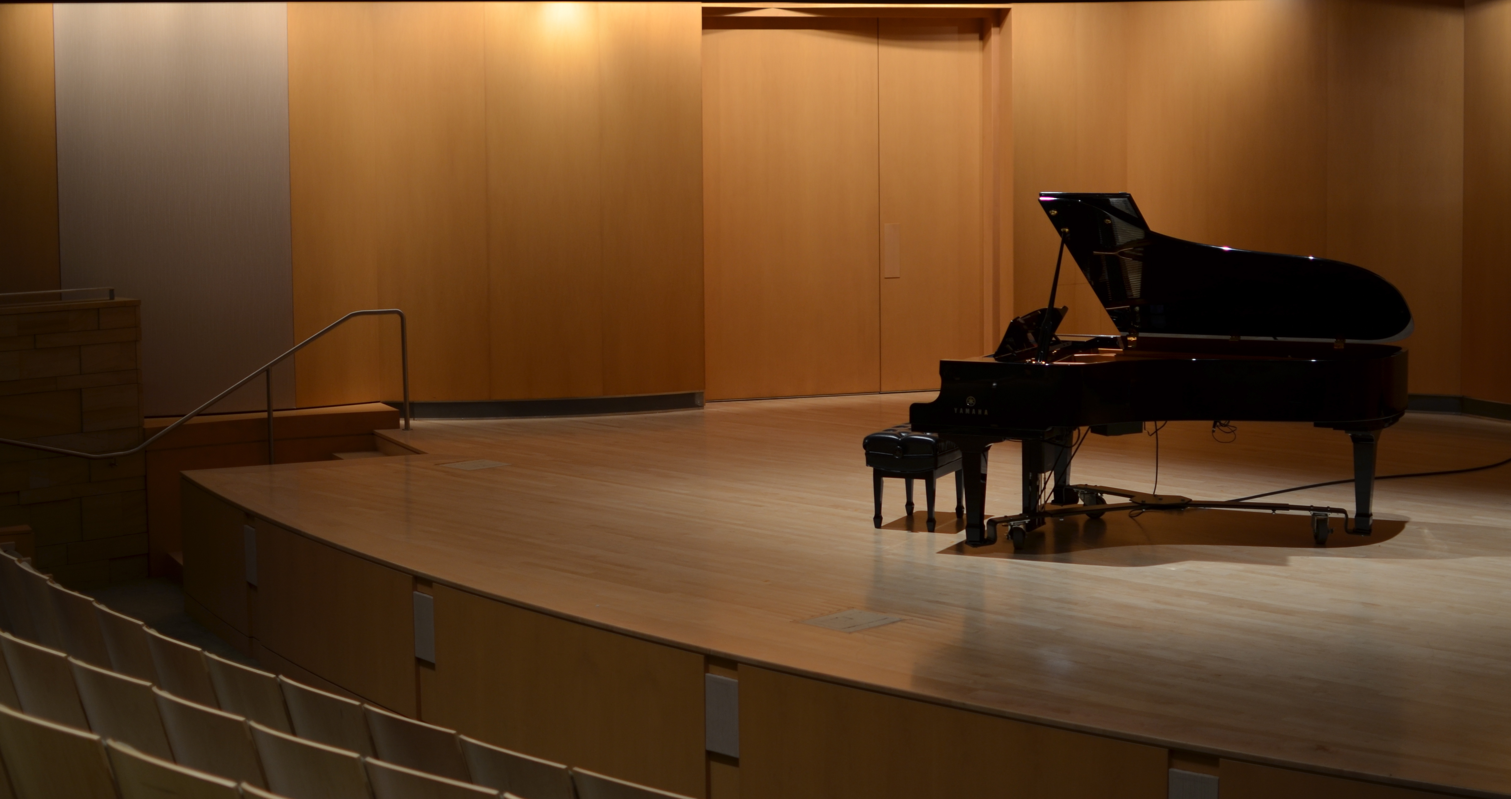 The MIM’s performance theatre is, like the rest of the museum, trim and clean to the eye, almost like a private recital hall. No garish private boxes, no Graeco-Roman splendor, just simple space arranged modestly. I loved having a private shot at the bare stage adorned only by the house piano, but my first shots were giving me too much for the eye to do. Wood grain, the physical details of the piano and seats, different shades of light from orange to gold to beige to off-white…I felt the whole thing needed to be turned down somehow. However, by the time I came to this decision, I was back home.