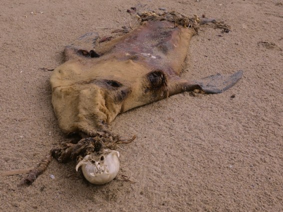 This dessicated pelt, a lunch opportunity for shorebirds and scavengers along the Hollywood Beach, was once a young sea lion. Its bones now picked clean down to the very contours of its skull, it is, sadly, also a more frequent sight for those of us walking the area coastline. Hundreds of sea lions have been washed ashore to suffer and die this year along the California coast, poisoned by an invisible scourge happening silently out to sea. A compound called demoic acid, a species of plankton, is in a state of high surge at present. That is to say that chemical changes which typically convert very small amounts of it to a deadly neurotoxin are currently churning it out like crazy. Fish eat the algae that contains it, apparently without harm to themselves, but sea lions eat the contaminated fish, and the result is an epidemic of sea lion death in San Luis Obismo, Santa Barbara, Ventura, and other coastal towns.