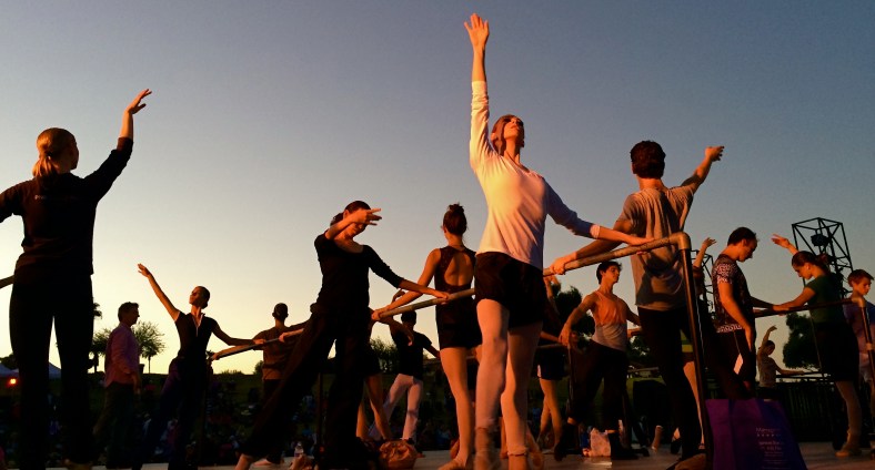 Climbing the gridwork at the right side of the stage, the techie was turning various lights on and off, trying them with gels, arcing them this way or that, devising various ways to illuminate the dancers as their director ran them through their paces. I decided to get off my blanket and hike down to the back edge of the stage, then wait for “my light” to come around in the rotation. Eventually, the stage hand turned on a combination that nearly replicated the golden light that I no longer was getting from the sky. It was single-point light, wrapping around the bodies of some dancers, making a few of them glow brilliantly, and leaving some other swaddled in shadow, reducing them to near-silhouettes.