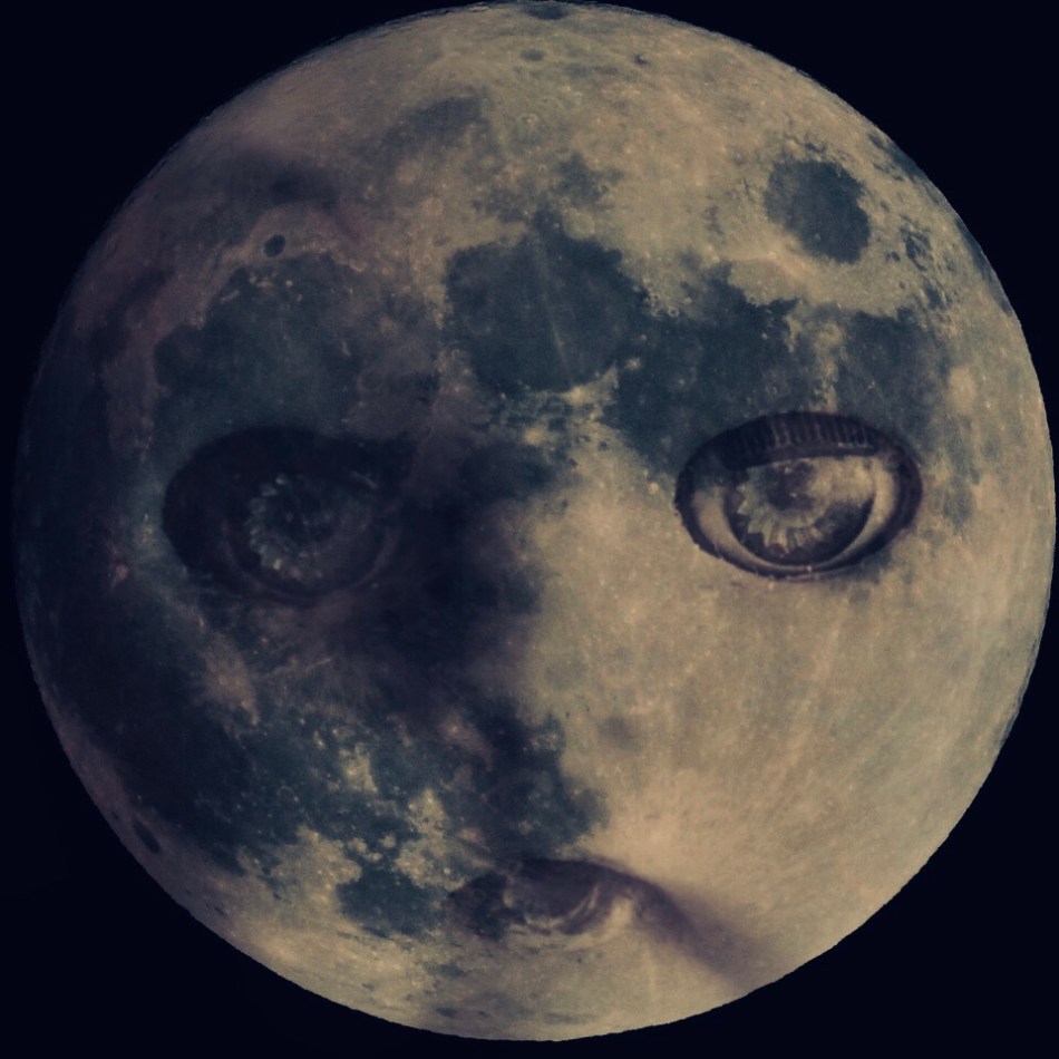 I wondered what a concerned, even sad version of that face would look like, as if the moon were desperately entreating us all to get our act together. I finally decided to re-use a closeup of one of my wife’s antique dolls, which had the right balance of sentiment and creepiness, and blended the two pieces on a phone app appropriately named Fused.
