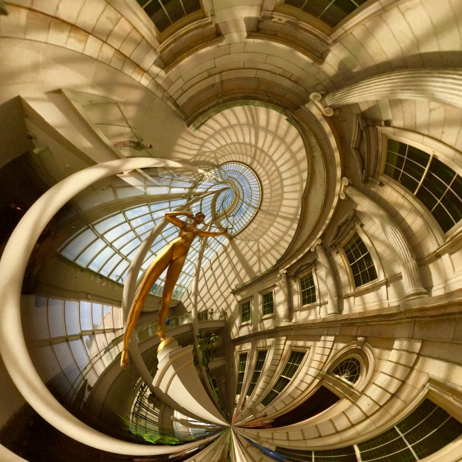 If you approach the use of such a specialized app in the simplest way, you’ll produce your five or ten little planet images (see photo at upper left corner), get the novelty boiled out of your blood, and then move on to something newer and shinier. However, Rollworld and programs like it can be a nice creative tool beyond their most obvious trick. The various sliders in RW let you not only roll your original linear image but control how it rolls, allowing a kind of folding-in, folding-out distortion. You can thus completely abstract even the most mundane cityscape into a symmetric pattern of textures, maximizing small things or relegating prominent features to the background. Other Rollworld sliders allow you to determine the tightness or looseness of the roll, to control the angle of the pitch, even swipe features from one part of the image across parts of the others to mirror or multiply specific items into a better symmetry. Call it Kaleidoscope-in-a-box.