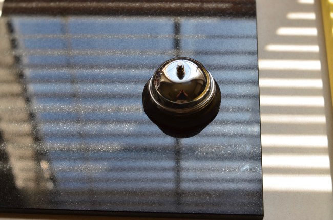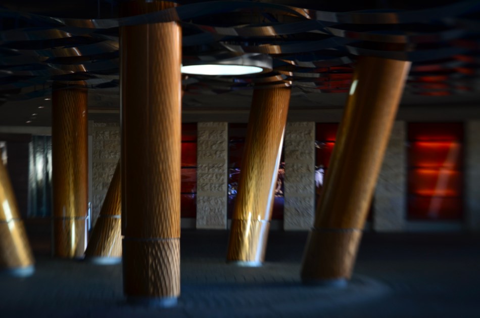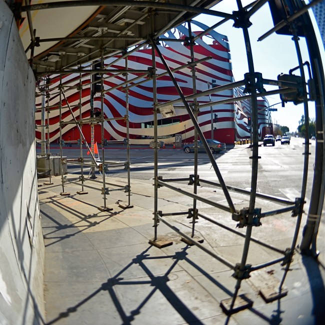 And, as it turns out, that’s the way to reverse-engineer a photo of the museum, since it’s possible to walk behind the swirly facade and into a shadow-and-color-saturated buffer space that exists between it and the underlying structure. From inside said space you can view the outer bands as a peekaboo grid through which you can view neighboring buildings and local traffic, rather like looking between the slats of some big psychedelic set of venetian blinds. And that’s where I stood when taking the above shot with a Lensbaby Composer Pro lens with a fisheye optic, the aperture set at about f/5.6 to render the whole thing somewhat soft and dreamy. I’ll see your two weirders and raise you one bizarre.