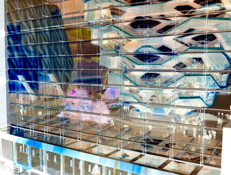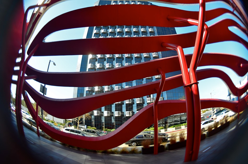 Whenever I visit Los Angeles, I am constantly looking for some kind of reversal pattern, a way to treat the most outrageous visual artifacts on their heads. I don’t always succeed. I did, however, have fun trying, recently, to come up with a new way of seeing a very strange building, the Peterson Automotive Museum, located at the intersection of Wilshire Boulevard and Fairfax Avenue, the outside of which has undergone a very radical facelift in recent years. From afar, the building seems to be a wild, untethered series of curves and swoops, a mobius strip of red and steel spaghetti floating in space in an abstract suggestion of motion. It’s a stunning bit of sculpture that actually is a wrap-around of the original, far more conventionally-shaped museum building beneath it.