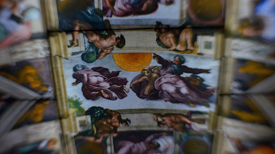 In the beginning, God creates man, an abstraction of himself. Then Michelangelo creates an abstraction of God (and a lot of other Biblical superstars) by depicting Him in the act of creation, even as he (the painter) is also abstracting representations of the Creator’s creatures. Centuries later, art historians take selective pictures of Michelangelo’s massive abstractions on the ceiling of the Sistine Chapel, abstracting them further by using selected excerpts as book illustrations. Inspired by those books, curators in Manhattan create an exhibit honoring Michelangelo’s ceiling by reproducing it as a miniature, assembling a replica composed of dozens of backlit transparencies suspended over guests at the Metropolitan museum in an artificial abstraction of the original Sistine frescoes. Finally, using a selective-focus art lens in 2017, I abstract those same guests to blobby smears of color and make editorial choices about which single panel in the faux-ceiling exhibit to shoot in sharp focus, thus hinting that it’s somehow more important than all the others.
