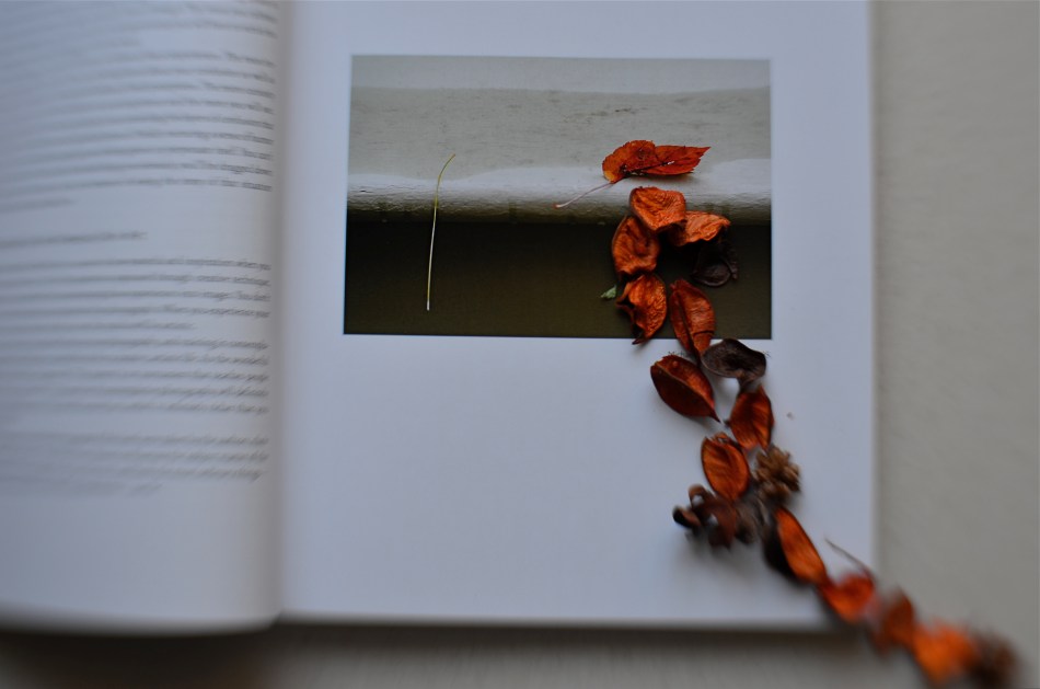 The composite image seen here is an attempt to take Michael Wood’s beautiful picture, a minimalist shot which shows a single orange leaf balanced on a ledge, and imagine what kind of picture might be a visual sequel to it. I used a Lensbaby Sweet 35 optic to keep the original photo’s sharp focus on his leaf, which, as it trails down the stream of added orange potpourri pieces, transitions to softness….as if, in a dream, the leaves might be seeming to erupt out of the page. So, if you’re keeping score, the starting photograph is shown in the context of the book in which it originally appeared, with added objects that I have arranged for a new overall photo-creation of my own. Please note that in every single posting of this picture, I have given specific credit to the original artists/authors, and represented it as an appropriation, the use of elements not my own for a re-imaging that is my own. I would never seek credit for the original Wood image: it did serve, of course, as a springboard for something else. And, if at some time, I am asked by said creator to remove any and all traces of my composite from public platforms, I would acquiesce immediately.