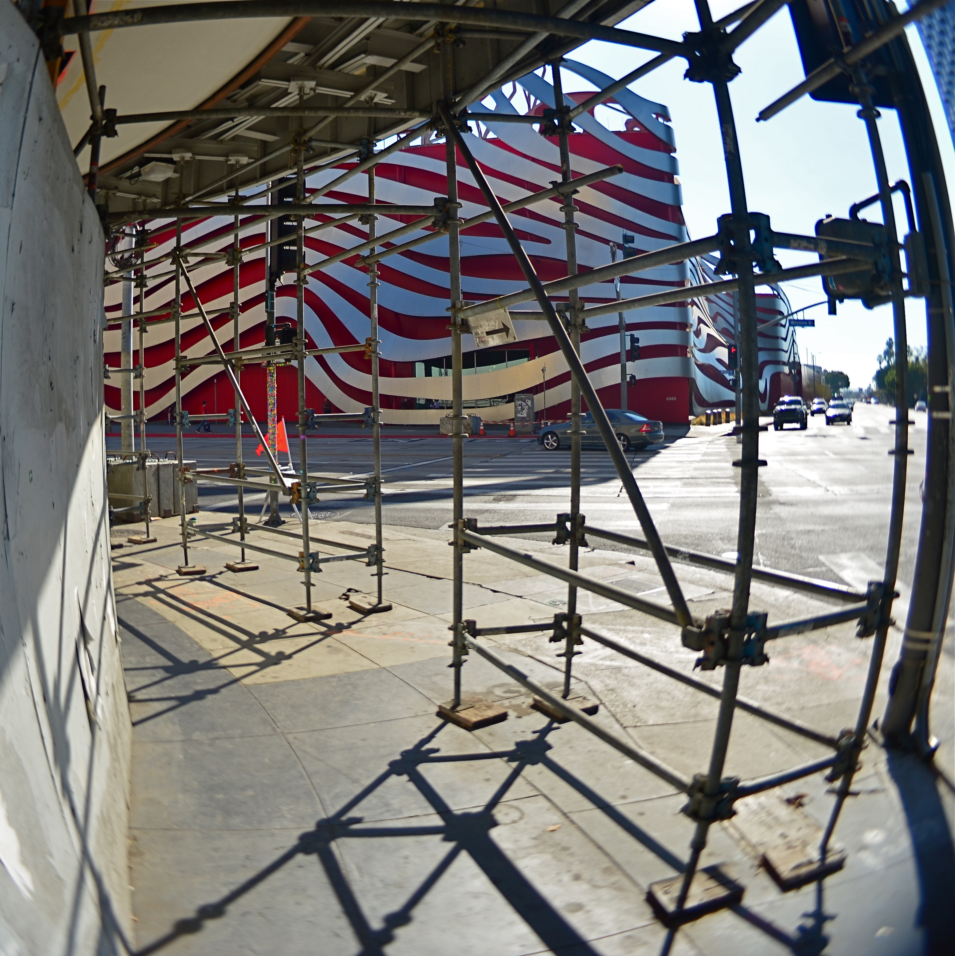 Whenever I visit Los Angeles, I am constantly looking for some kind of reversal pattern, a way to treat the most outrageous visual artifacts on their heads. I don’t always succeed. I did, however, have fun trying, recently, to come up with a new way of seeing a very strange building, the Peterson Automotive Museum, located at the intersection of Wilshire Boulevard and Fairfax Avenue, the outside of which has undergone a very radical facelift in recent years. From afar, the building seems to be a wild, untethered series of curves and swoops, a mobius strip of red and steel spaghetti floating in space in an abstract suggestion of motion. It’s a stunning bit of sculpture that actually is a wrap-around of the original, far more conventionally-shaped museum building beneath it.