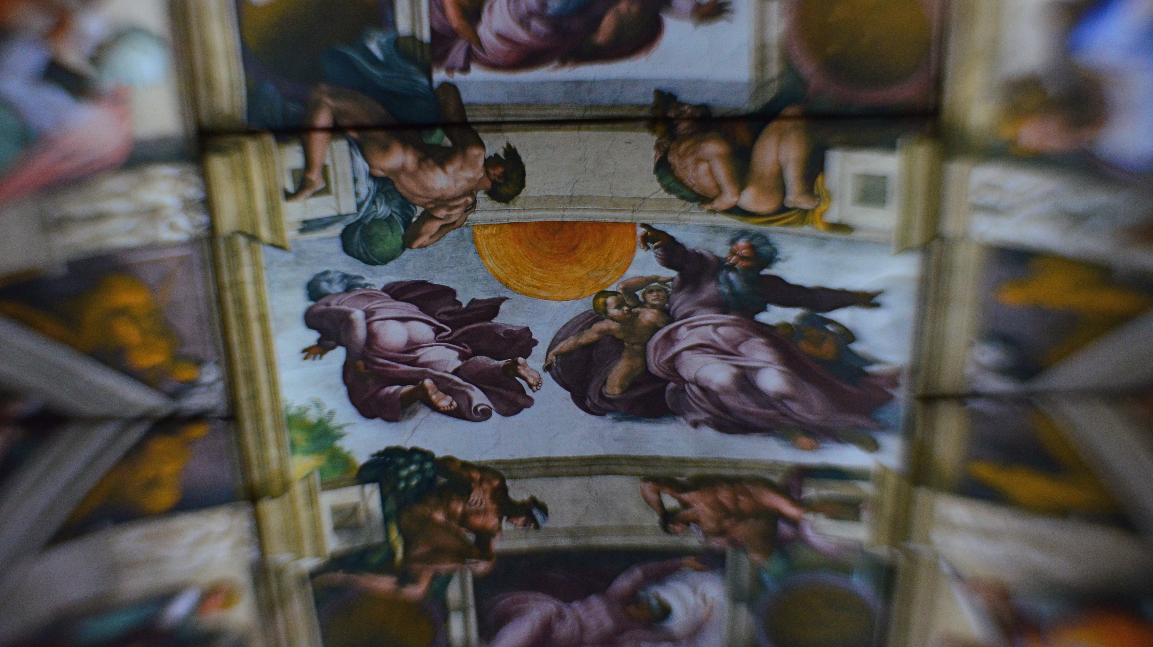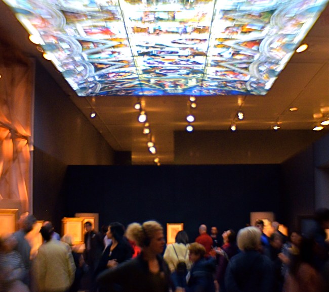 In the beginning, God creates man, an abstraction of himself. Then Michelangelo creates an abstraction of God (and a lot of other Biblical superstars) by depicting Him in the act of creation, even as he (the painter) is also abstracting representations of the Creator’s creatures. Centuries later, art historians take selective pictures of Michelangelo’s massive abstractions on the ceiling of the Sistine Chapel, abstracting them further by using selected excerpts as book illustrations. Inspired by those books, curators in Manhattan create an exhibit honoring Michelangelo’s ceiling by reproducing it as a miniature, assembling a replica composed of dozens of backlit transparencies suspended over guests at the Metropolitan museum in an artificial abstraction of the original Sistine frescoes. Finally, using a selective-focus art lens in 2017, I abstract those same guests to blobby smears of color and make editorial choices about which single panel in the faux-ceiling exhibit to shoot in sharp focus, thus hinting that it’s somehow more important than all the others.