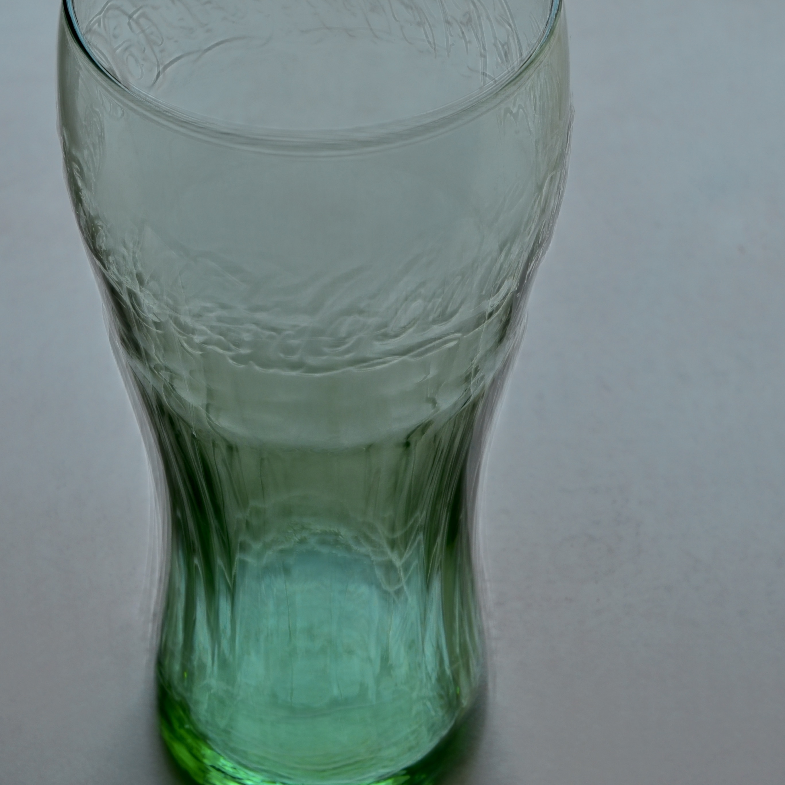 In the image of a Coca-Cola drinking glass seen at left, I shot about 18 frames, merely rotating the glass a bit between shots and keeping the camera on a tripod triggered by a remote. I was careful not to let the central core of the glass move too far left or right, using it as the anchor for the project, allowing the embossed script on the outside of the glass, as well as the shadows created by its vertical ribs, to flow into shapes that simply could never be rendered in a single image. I’m just starting to get a feel for what kind of subject matter will work best with the process, starting small, rather than heading for the local skyscraper, where the rotating process would be reversed, with the building staying constant while I circled around it.