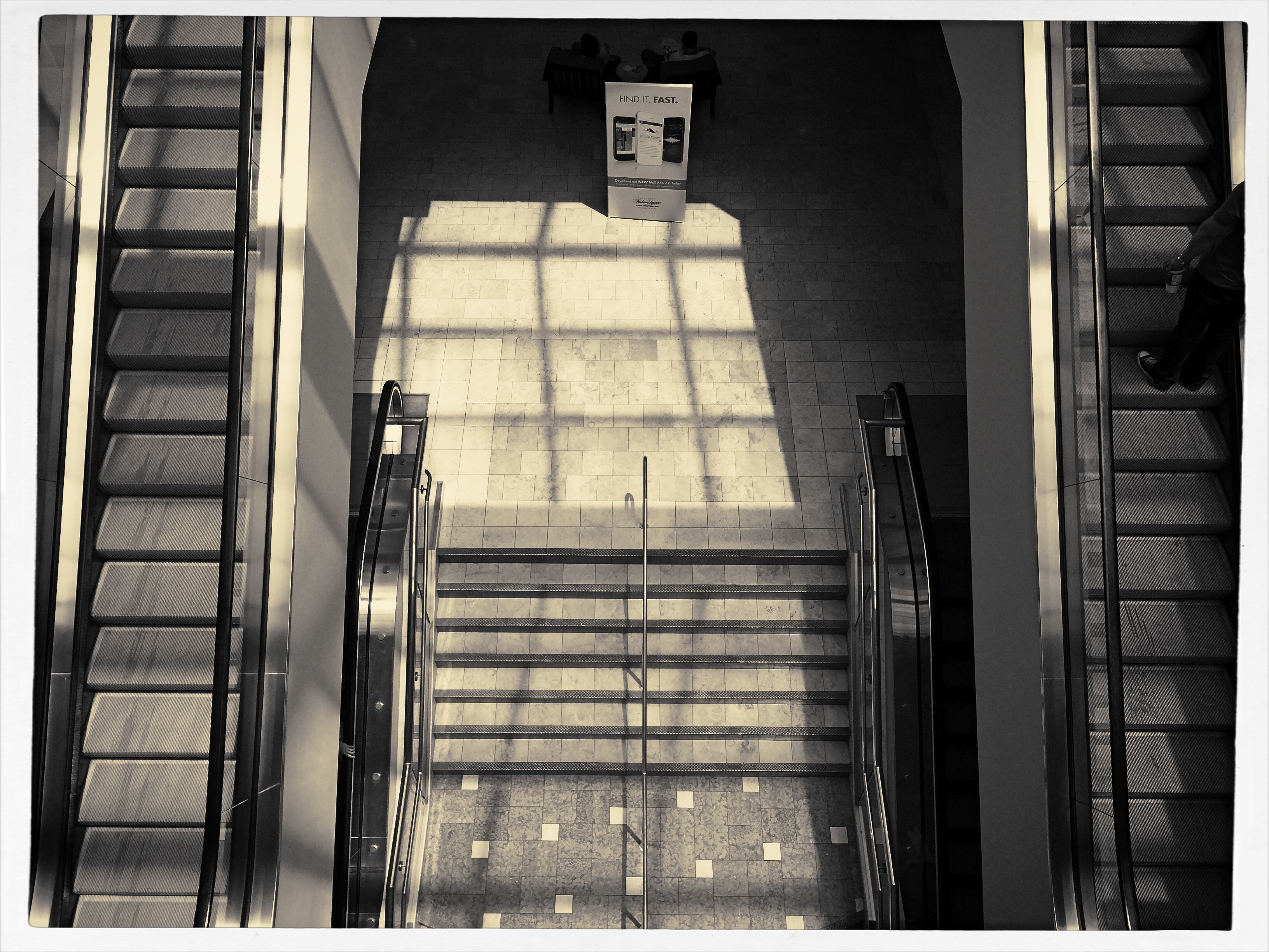 A glass elevator at a shopping mall, converted to a negative, then a fake Technicolor filter in a matters of seconds, via the phone app Negative Me.