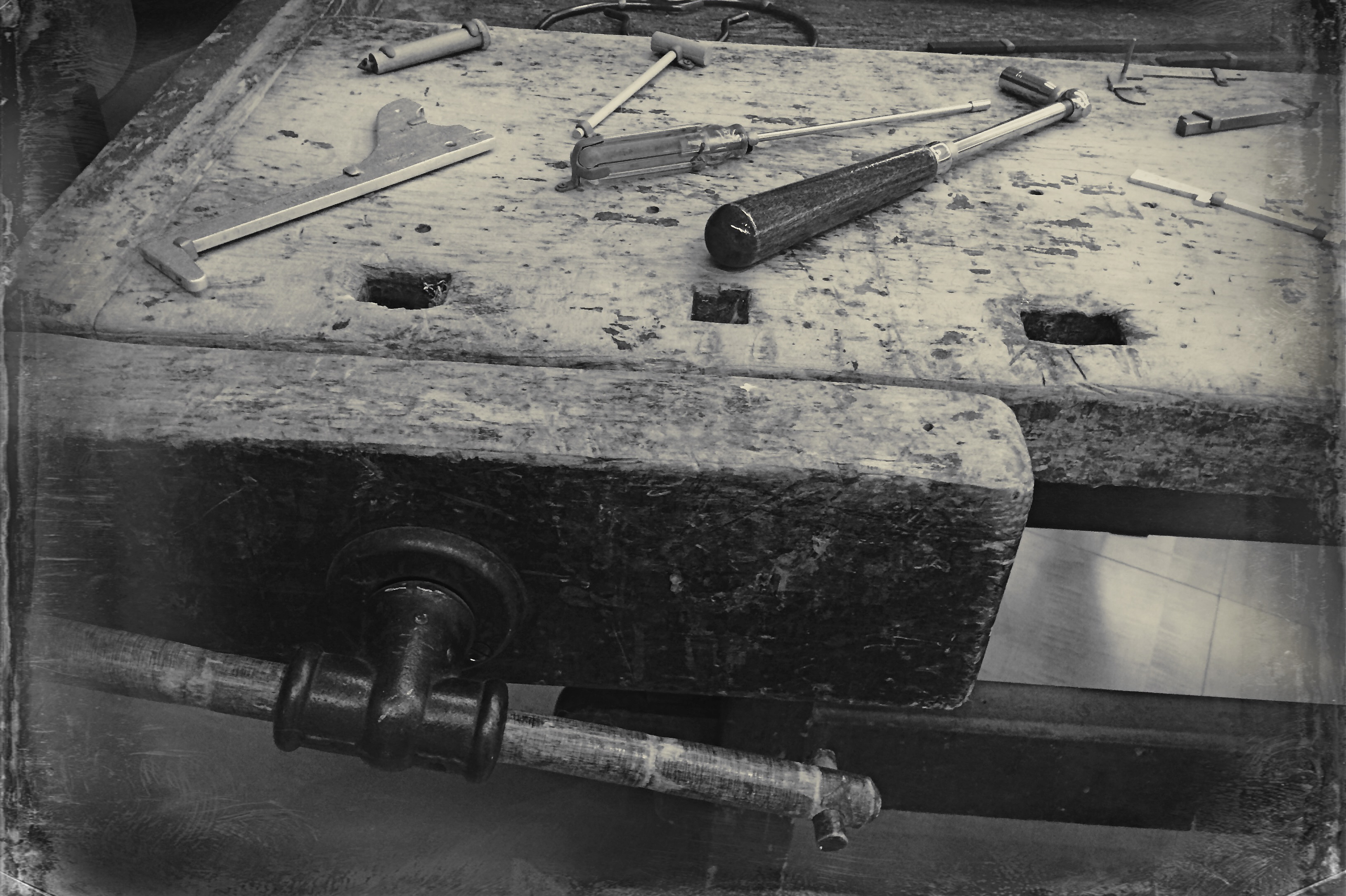 By basically simulating the subtle changes that a film processor could have made in the gradations between the various intensities of either black or white, apps allow you to make incremental judgments of how the values in the image work or don’t work to produce the “statement” you’re looking for. Best thing about this is the best overall thing about digital: how quickly you can act on your impulse, then check, adjust, and act again. The above image lacked impact in the color original. The old workbench simply came off too warm and charming. I was looking for something that matched the grit and wear of the weathered wood, and I was able to shop for about three different grades of monochrome before settling on what you see here. Most days, this is a game of inches.