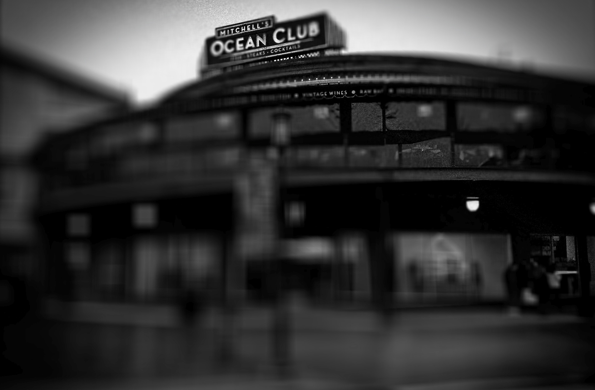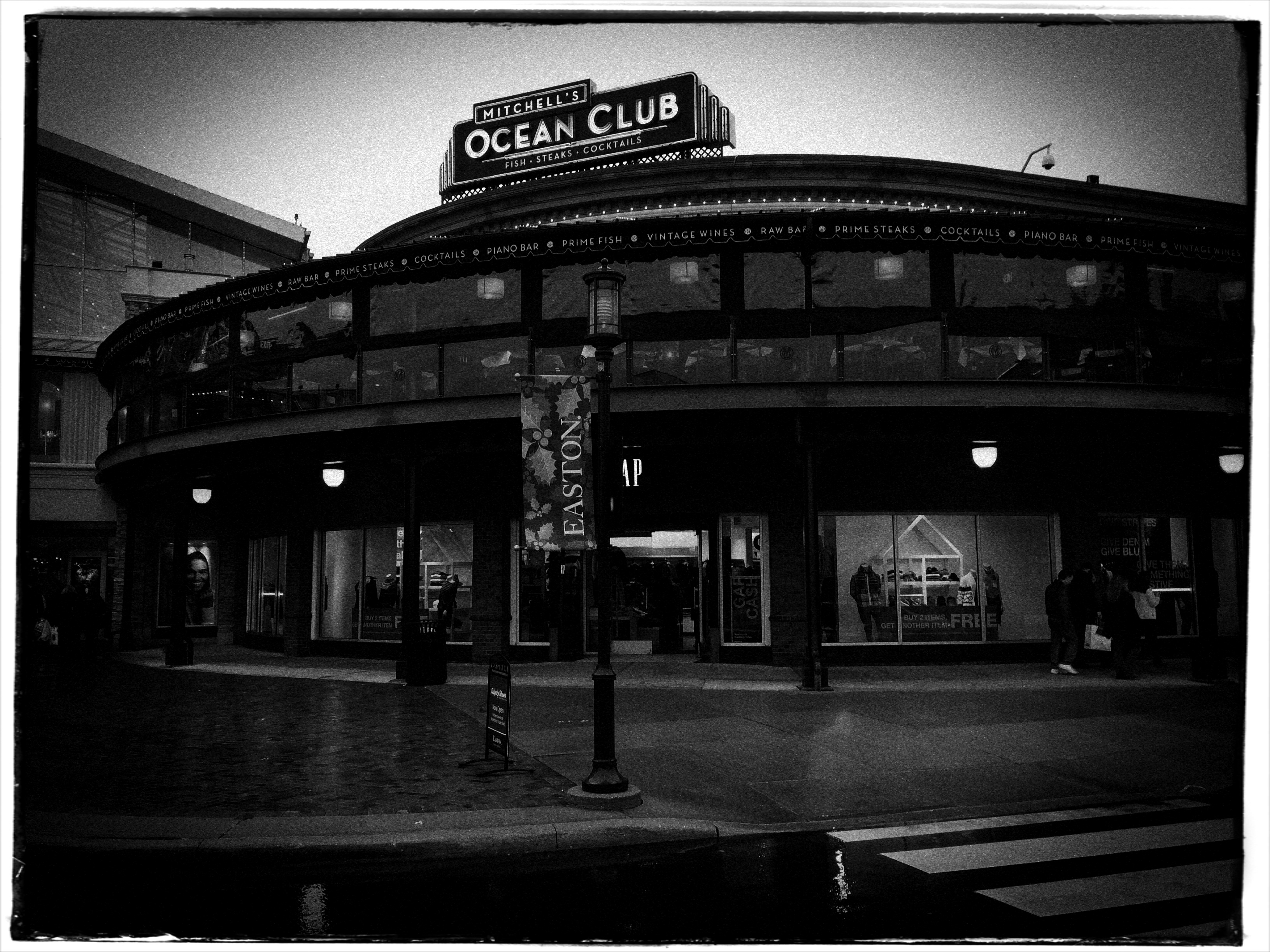 In the shot at the top of this post, I tried to create mood in a uniquely shaped fish house with monochrome and a dour exposure on a nearly colorless day. Thing is, the image carried too much detail to be effectively atmospheric. The place still looked like a fairly new, fairly spiffy eatery located in an open-air shopping district. I wanted it to look like a worn, weathered joint, a marginal hangout that haunted the wharf that its seafood theme and design suggested. I needed to add more mood and mystery to it, and merely shooting in black & white wasn’t going to get me there, so I ran the shot through an app that created a tilt-shift focus effect, localizing the sharpness to the rooftop sign only and letting the rest of the structure melt into murk.