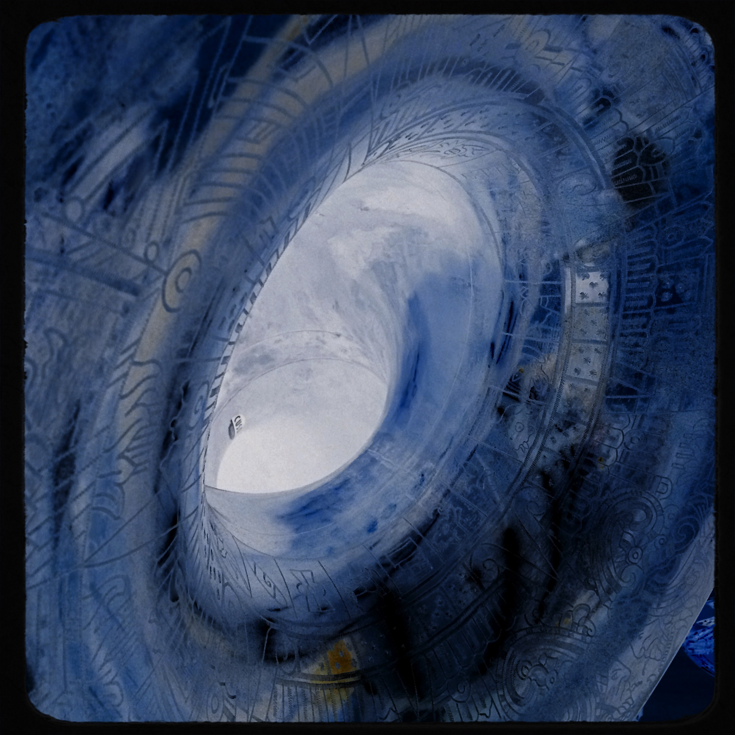 The bell of an engraved sousaphone, converted into a negative and color-boosted to resemble a faux vortex.