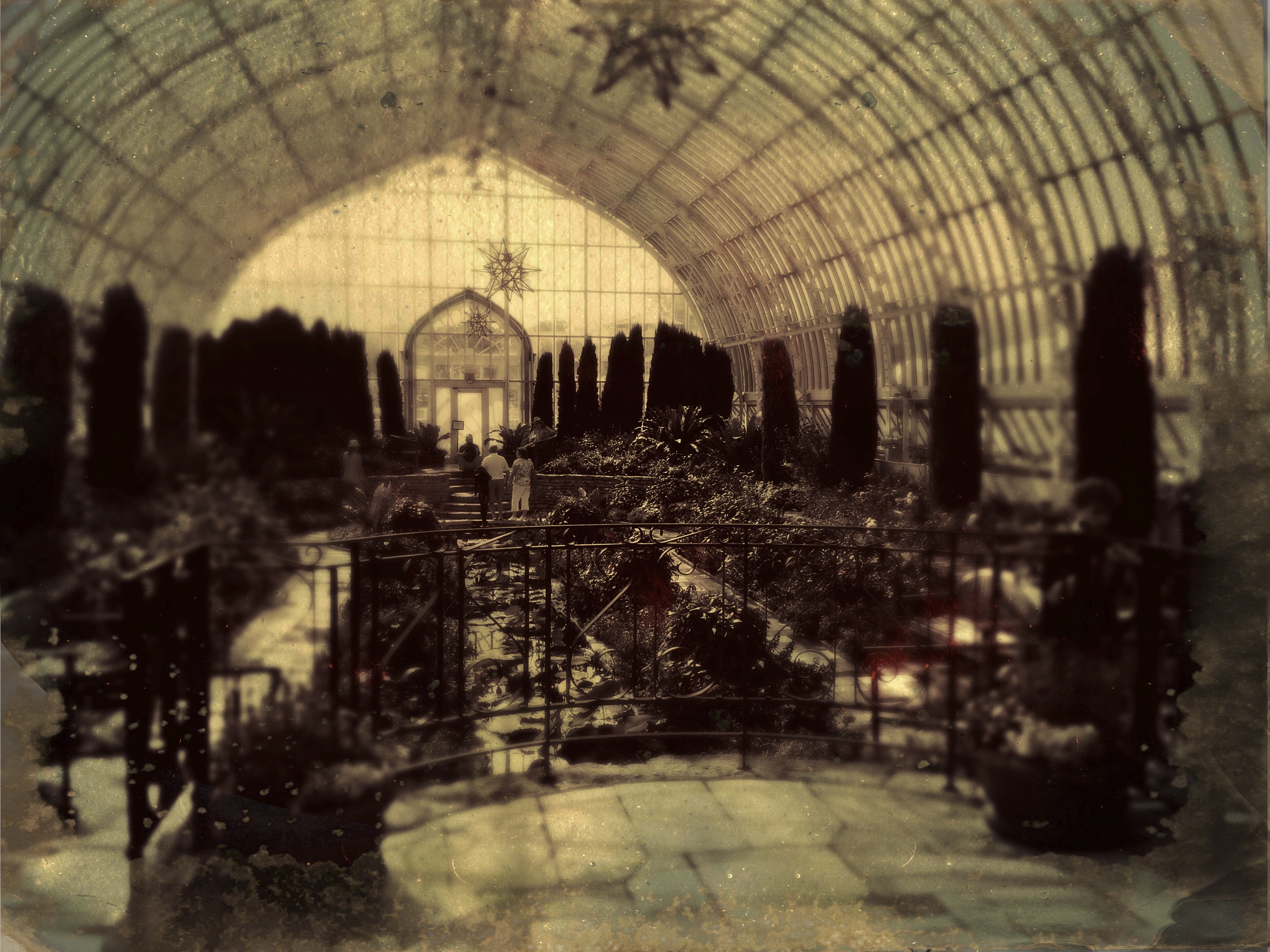 In the above picture, for example, I’m merely playing, without any real object in mind. The master photograph on which this remix is based was taken two months ago (Summer 2019) at the main greenhouse building at Minneapolis’ Como Park. The structure’s classic design, complete with rounded cupolas and gently curving rooflines, reminded me of the immense halls that were erected in the 1800’s to house international expositions, industrial shows and world’s fairs, and so I took a fairly straightforward shot from a cell phone and cranked it through an app to evoke an echo of that time, a visual masquerade that mimics the tintype process, right down to its selective pinpoint focus and plate grain. Admittedly, the illusion is spoiled a bit, since the people in the picture are wearing shorts and t-shirts rather than bustles and straw boaters, but that’s not the point. I wasn’t trying, like some master art forger, to make you think this was a newly discovered artifact of the Victorian age. And while I might have been trying to comment on “how we used to think of the purpose of grand public spaces”, or how that contrasts with the public spaces we value now…..I wasn’t. I was just goofing off, using quick and amazing tools the way a child might take Mr. Potato Head’s nose and put it where his ear should be.