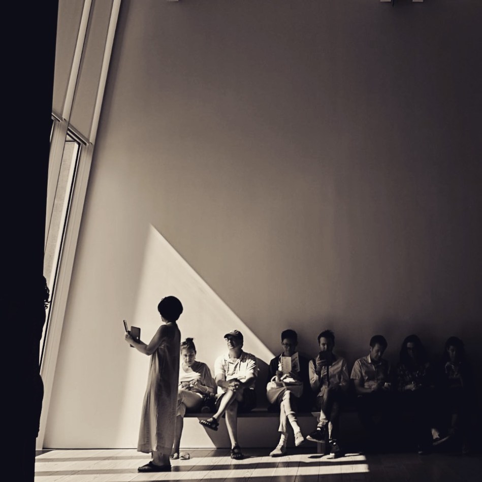 In the image shown here, the “official” delights of the museum in question have failed to amaze, at least for the group occupying the bench. As for the woman peering out the window, she has simply found something with bigger “wow” value than anything hanging on the walls. The sheer dimensions of the space threaten to dwarf the group, to make it seem small or insignificant, and yet their faces and bodies contain a strange mix between tension and ennui that is so wonderfully human that it invites the investigative eye of the shooter.
