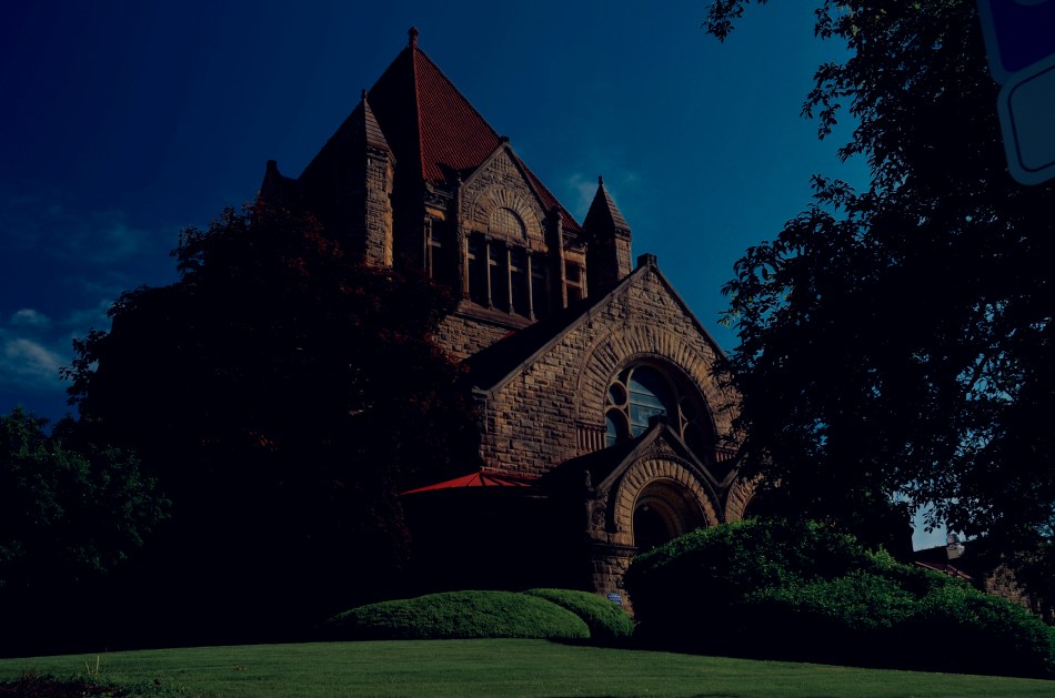 One of the simplest ways I myself re-juggle the intention of a shot is in the light relationships. The image you see in the thumbnail here is an original from a series of shots I took on a gorgeous Saturday morning in spring of 2015, conditions which perfectly served the picture of the church as I first envisioned it. The sunlit version emphasizes detail and a very light color scheme. By comparison, the reprocessed version (above) is practically what movie folks used to call “day for night”…that is, shooting during the day in such a way that resembles night, but preserves discernible information in a way that true night shooting obscures. The color scheme is very deep, and nearly all detail is sacrificed except that of the front of the building, which is made to appear as if it were illuminated by the warm light of a setting sun. The shift of the intention exchanges the effect of all that fine detail for the impact of understatement. More to the point, I don’t need to show the grit of every stone or the grain of every slab of wood to make the picture work, and so what is paramount in a day-lit shot becomes expendable, even excessive, in the nighttime version.