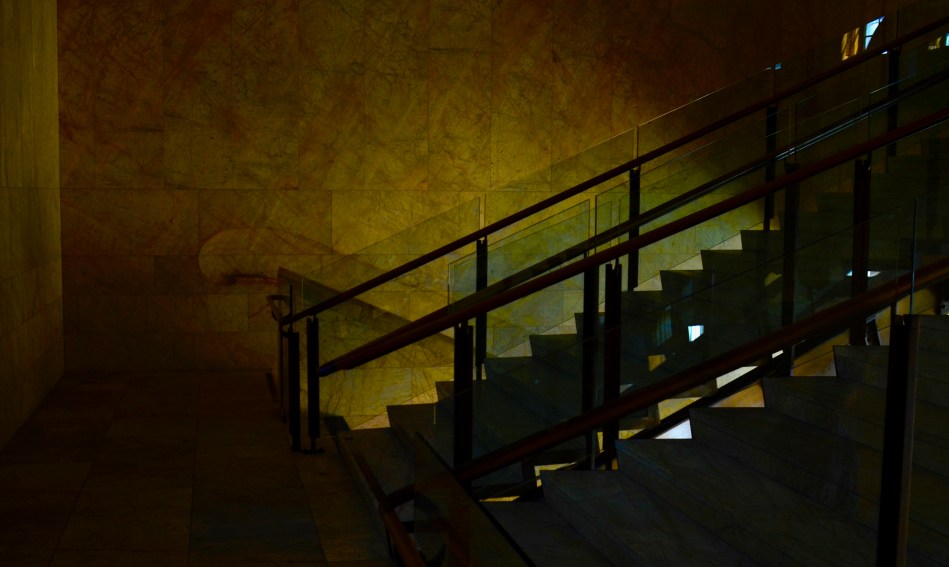 The shot you see here was actually a very instantaneous one, the keeper among three or four frames, and, unless you love stairs, the picture is not “about” anything per se: the subject matter, the story, is light. But look at the light there was to work with! It has gradations from yellow to gold to red to green: it reveals and conceals at the same time: and it’s such a great “explainer” of the marble texture that nothing else needs to be going on in the shot….it just is. Now, everyone is different. I myself could easily have missed this shot, fixated as I was on where I was heading and worrying about having enough time once I got there. But trying for this image only cost me seconds, yet it was time enough to pair with opportunity and give me…options. Learning to see is not only about having things register on the optic nerve: it’s also about learning to think editorially, discriminately. To being open. Looking back over the camera roll this came from, the thing I was scrambling up the stairs to shoot was actually a bit of a disappointment. The thing on the way was, in reality, a better way to spend my time, and exercise my eye.