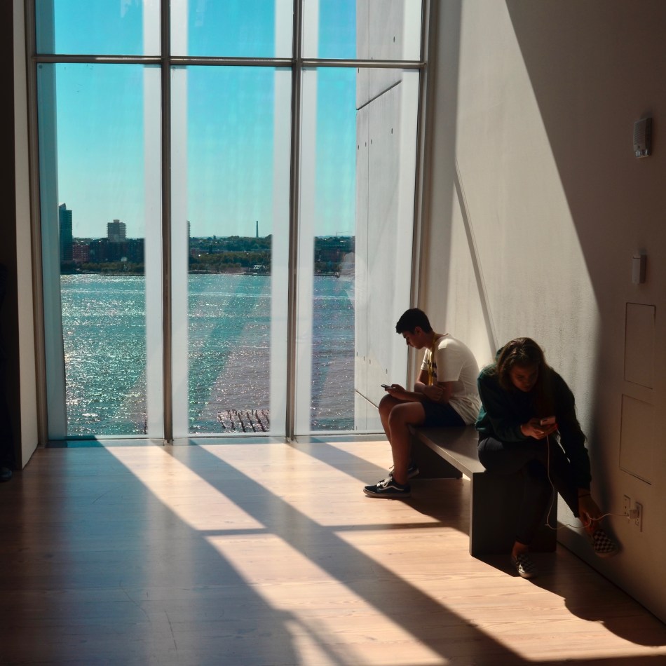 I really had no interest in the two people in the frame other than their ability to take up compositional space and account for a wide range of light contrast, something I always like to practice with. So I must be honest and report that, in the actual taking of the picture, their “story” was not on my radar. Moreover, given how many hundreds of other “phoners” I’ve accidentally recorded, usually concluding that there was “no picture there”, I think I can be forgiven a certain dismissiveness in snapping the photo. It was only later that the completeness of their isolation struck me. Not only are they facing away from the somewhat scenic, bright view out the window, but they are completely isolated from each other. As it happens, they are in a Manhattan museum which, even if you were to completely eschew the contents of the exhibits, offers any number of stunning skyline scenes out the windows, including several high-rise walk-out platforms. But none of that matters to this pair, any more than they matter to each other, or whether a live, nude performance of King Lear would matter, were it just inches away from them. Their place in the present world does not matter…..only their proximity to a wall outlet. This, to me, is beyond isolation. This is self-banishment, and, in this case, the image I accidentally snapped of the condition shows, at least in miniature, the crux of the dilemma: the fact that we have become one international village of strangers.