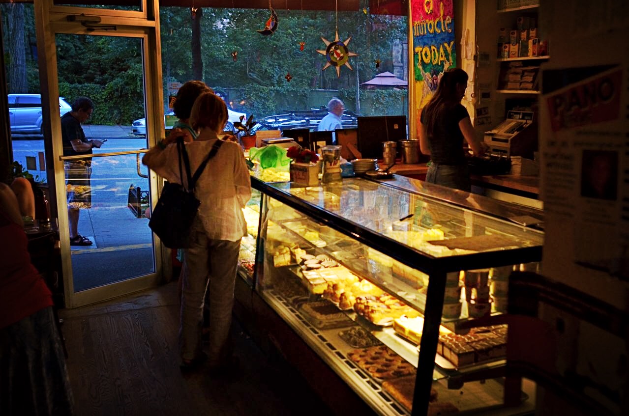 Most places of business naturally react to the daily dying of exterior light by turning on their interior lamps. Sun goes down, lights go up. But occasionally, as in this wondrous and quirky little bakery cafe in Morningside Heights in Manhattan, the comfort food was accompanied by what could easily be termed comfort light. The lights inside the pastry case, at least during this particular evening, were allowed to serve as the only illumination for the entire inside of the store, lending the customers around the counter the warm intimacy of a shared fireplace.