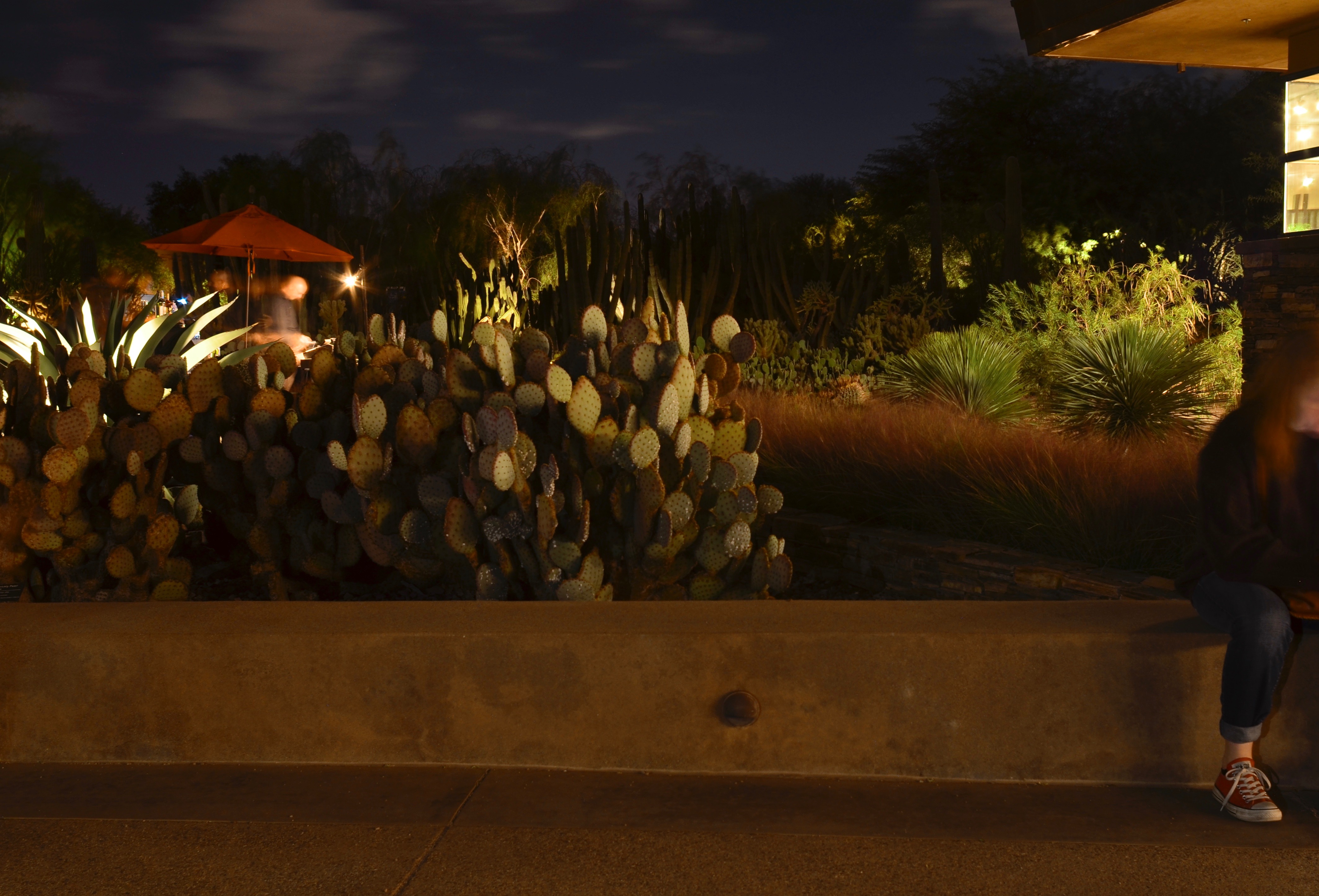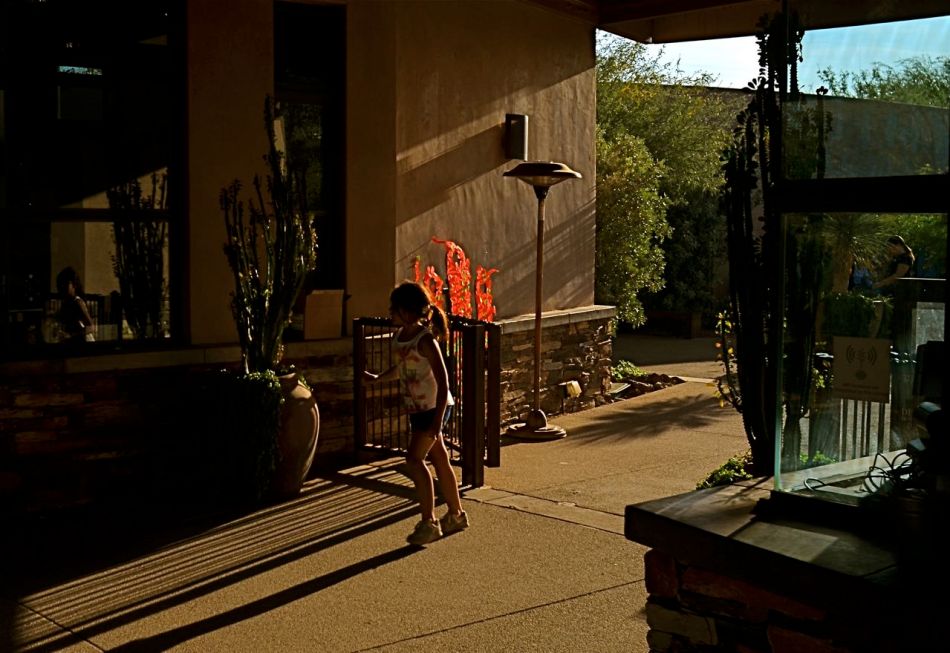We’ve all see those essays in which a photographer stays in one position along the rim of the Grand Canyon for many consecutive hours, interpreting the color and light shifts in the gorge over the course of a single day. But you don’t have schedule a vacation in Arizona to make your own demonstration of this idea. Anything that you think you know about, or know the “best” way to photograph, will make a good test subject. As a matter of fact, the more ordinary the scene, the better, since your evaluation of the results will force you to concentrate on just the light values alone, without excess distraction. For an example, the image seen here is of a desert botanical garden in the American southwest an hour after sunset. The sky as seen here is not brilliantly blue, but neither is it absolutely black. The concrete wall in front, beige during the day, is feeding off the sodium lights from the gift shoppe at right and registers as orange. The greens in the agaves and succulents are not the same tepid hue that they’d “read” in the afternoon, becoming something a bit more emerald-ish, while the shrubs are a more pronounced gold than they’d register at noon. More interestingly, all of the colors, transformed from the familiar, are now in a different dialogue with each other. Their relationships seem off, lending a slight surreality to the scene. I only wish I had thought ahead to take several more images spaced over an entire day to better demonstrate my point, although I know, from having done so in the past, that the contrasts can be quite dramatic.