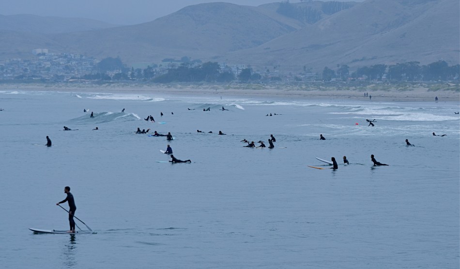 Lizzie and Mark’s stick figures moved every bit as well as my fully-rendered players, but their impact was more immediate. Their drawings didn’t have even a single line that wasn’t absolutely essential to their narratives. I thought of all this recently when working with some distant crowds which were reduced to mere silhouettes in a deep telephoto of the coastline at California’s Morro Bay. As components in a larger composition, they were just markers, measures of linear space. Shooting even closer might have revealed their hair color, lines on their faces or the shine of water on their wet suits, but to what benefit for the overall effectiveness of the picture?