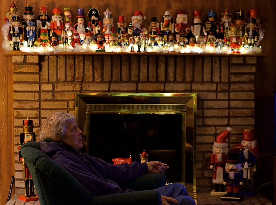 In the above photograph, I was initially looking to steal a candid of my father as he watched some television. It should have been a simple task, but, when your father is still here at 88, the faces of those no longer here echo in his every feature. To add to the density of emotion, you have the fact that he’s seated beneath a mantle fairly buckling under the weight of a third of a century’s worth of well-curated nutcrackers. Thus, even though she’s dodged having her picture taken at this particular moment (a well-honed skill), my mother is present here as well.