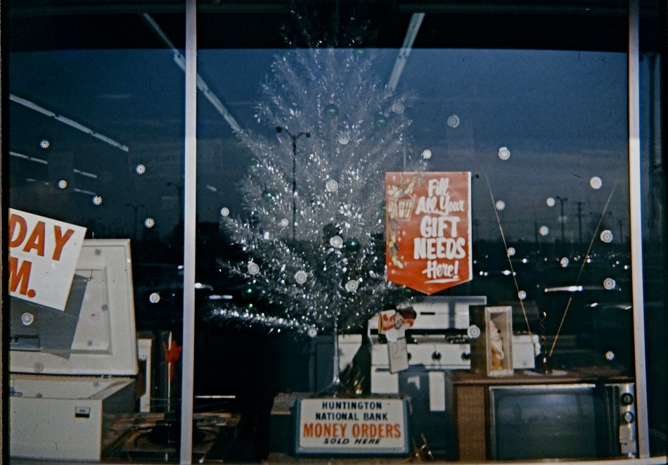 I was a very young thirteen in December 1965, and had only wielded my Imperial Mark XII box camera on a few occasions prior to the day I found myself wandering around Northern Lights shopping center in Columbus, Ohio, specifically past the display window of the Cussins & Fern Hardware Company. Like Charlie Brown, I thought that some holiday novelties, like the recently introduced aluminum Xmas trees were odd, even though I liked the included rotating wheels that projected ever-changing colors onto the silvery sticks in a kind of robotically cold imitation of gaiety. However, unlike Charlie Brown, I don’t think I regarded these abstract Future Trees as an affront to decency. I just thought they were weird.