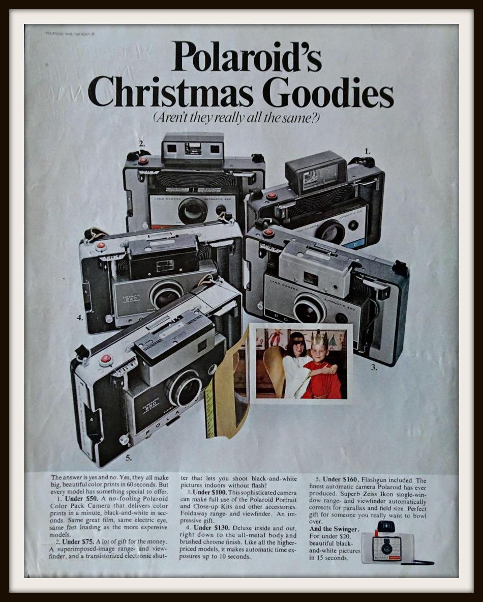 And so, Polaroid is dead and long live Polaroid. The above 1967 Christmas pitch for the original company’s full product line (read the fine print) gives testimony to the incredible instruments that once bore the Polaroid name. You can’t go home again, truly. Not to live, anyway. However, an occasional 60-second visit can be fun.
