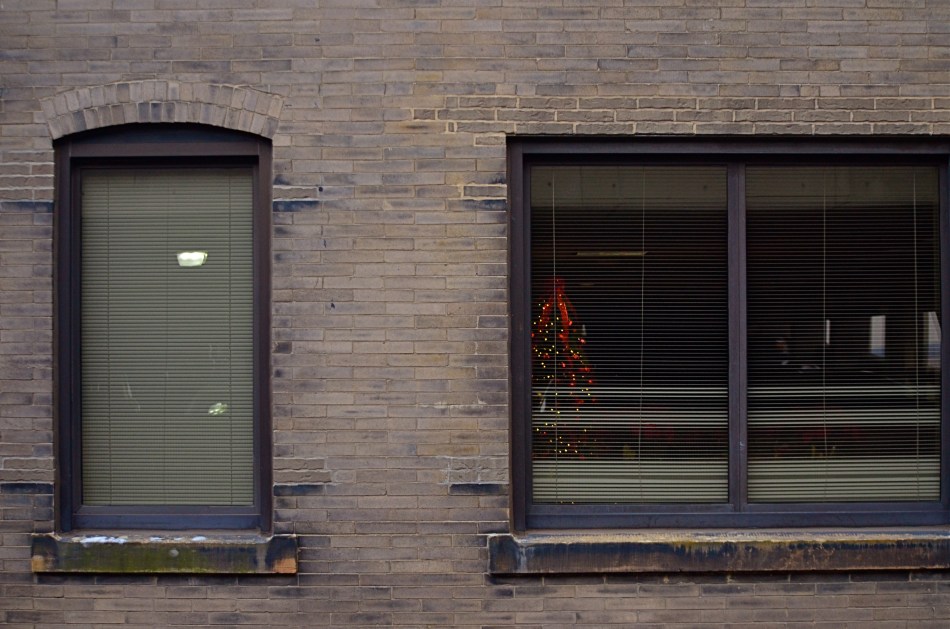 Some, as in the case of the picture seen here, are observed at the backsides of alleys, eight stories up in a parking garage, overlooked, unsung. But sing them we should, and picture them we must. Oversized dreams in department store windows are seductive, to be sure, a visual ode to If Only. But down here on the ground, where most Christmases are crafted, a lot more must be supplied by dint of imagination and dreams. Here, closer to the human heart, we learn to ignore our tattered hems, and to be brave in ribbons.