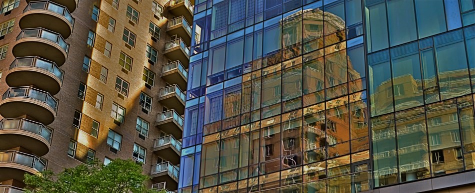 And, whatever your opinion of what came to be called the “International Style”, the boxes today co-exist with their more decorous ancestors, a contrasting mix which creates amazing opportunities for abstraction. The collision of the two periods creates an endless shuffling of visual cues, with all that glass and terra cotta dueling for dominance in our compositions. And therein lies a tip: one tool which you may find of enduring value in shooting in these situations is a circular polarizing filter, which can help you create a wide variety of effects…quickly, and on the cheap.