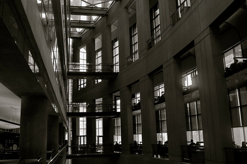 THE BUILDING YOU SEE HERE may not, on first glance, match your sensory memory of what a “public library” is supposed to look like. However, step into this amazing complex on West Georgia Street in Vancouver and you will certainly see, from every angle of its curvy vastness, the public….buzzing away at research, cozying next to comfy reads in cafes, tucked away in private warrens of study and solitude.