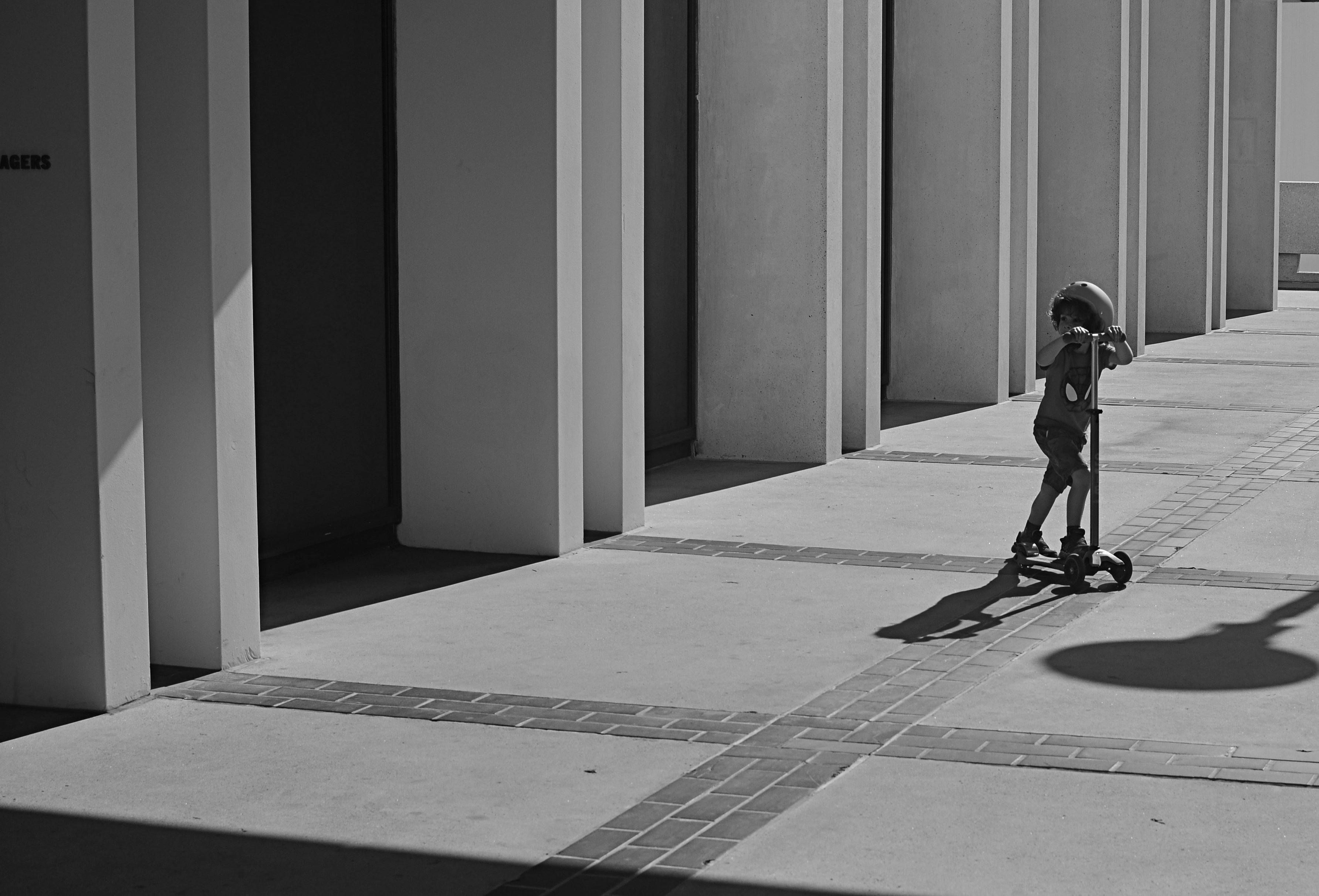 In the above image, the boy on the scooter is neither a “bad” nor “good” subject, but he gains a little amplitude because of his odd placement amongst the more antiseptic surrounding textures. The shot also worked a little better in monochrome because, in the original shot, the boy’s shirt was so vivid that it drew too much attention to that part of the picture.