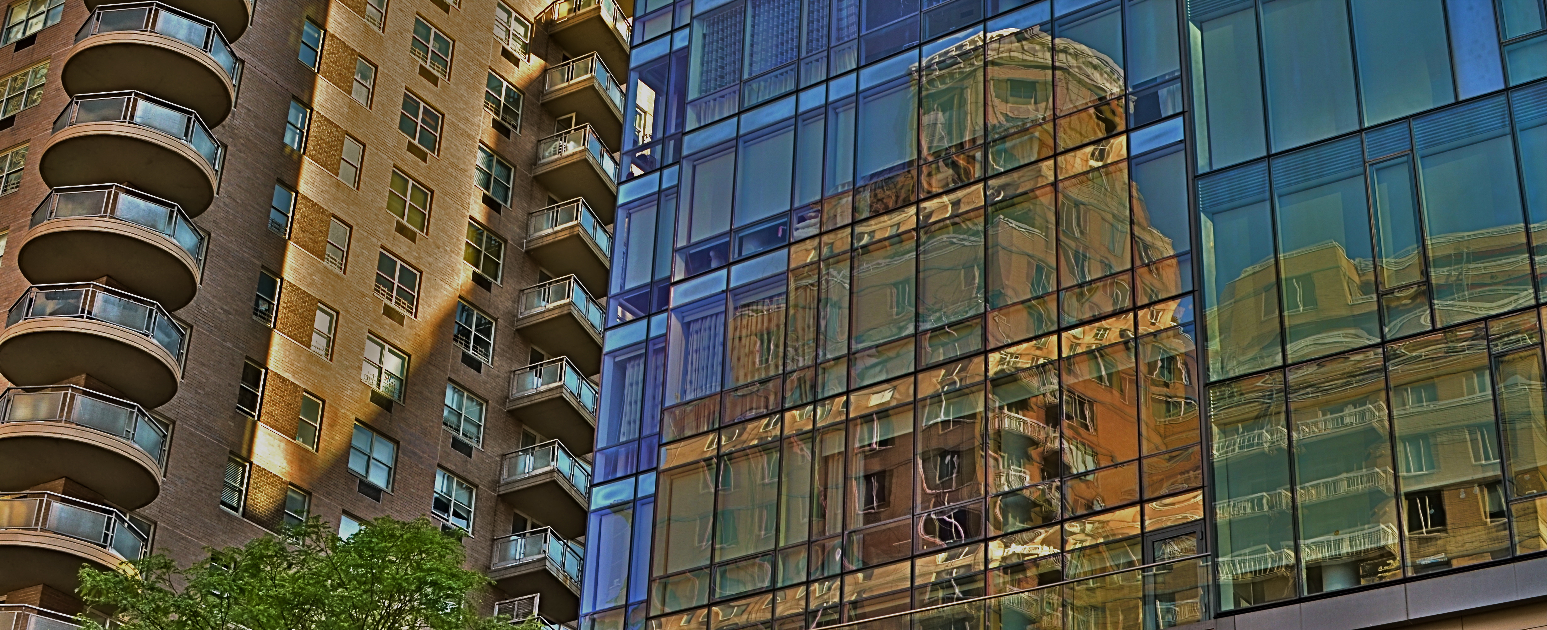 And, whatever your opinion of what came to be called the “International Style”, the boxes today co-exist with their more decorous ancestors, a contrasting mix which creates amazing opportunities for abstraction. The collision of the two periods creates an endless shuffling of visual cues, with all that glass and terra cotta dueling for dominance in our compositions. And therein lies a tip: one tool which you may find of enduring value in shooting in these situations is a circular polarizing filter, which can help you create a wide variety of effects…quickly, and on the cheap.