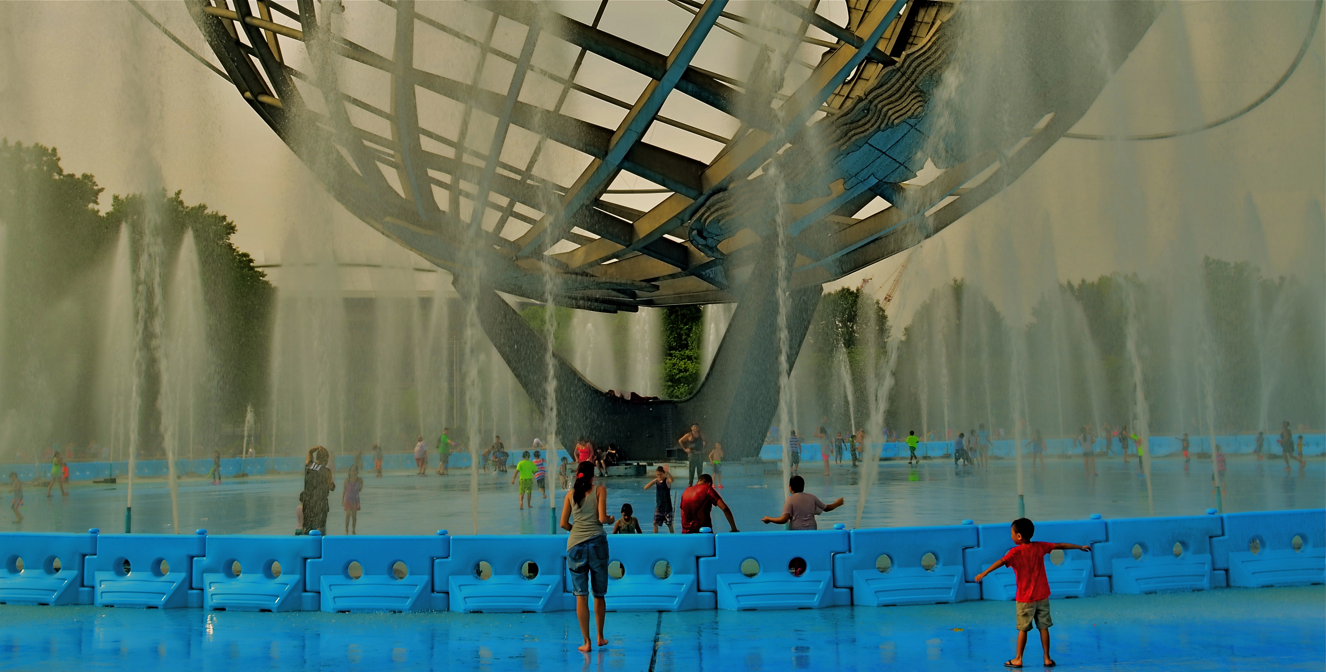 In shooting Uni myself for the first time, I found it impossible not only to include the people around it, but to marvel at how completely they now possess it. The decorum of the ’64 fair as Prestigious Event now long gone, the sphere has been claimed for the very masses for whom it was built: as recreation site, as family gathering place..and, yes, as the biggest wading pool in New York.