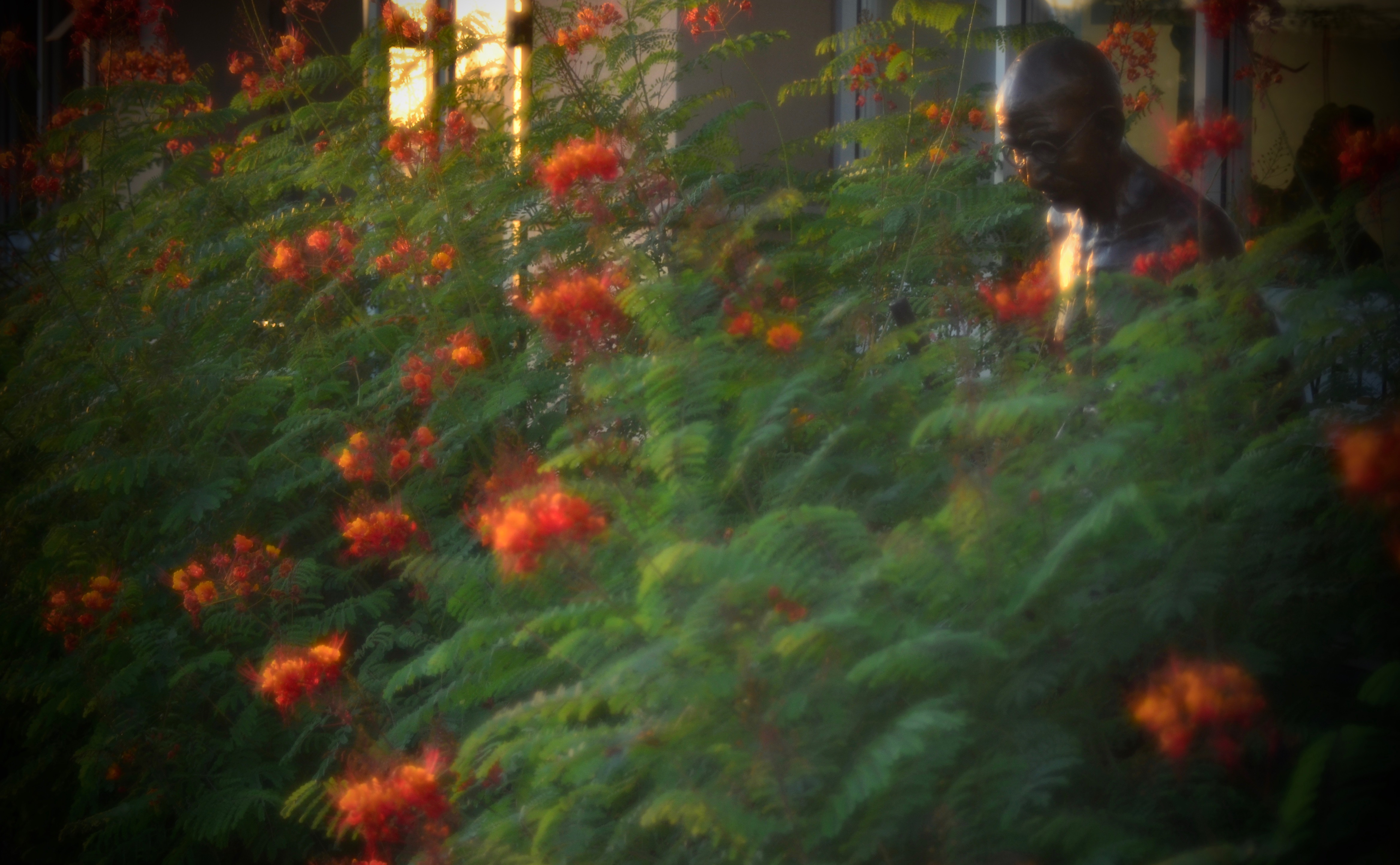 In the intervening period, and as they are wont to do, a very lush desert bird of paradise bush had sprung up, flowering fully by the end of this summer, nearly obscuring the Mahatma and placing him in a very different kind of visual space. Suddenly I visualized a design, or at least a design idea, for an image. In traditional Indian art, the same flame-tip orange found in the shrub’s flowers are a very dominant color, symbolizing sun, flames, birds, and the raiment of various gods. The sea of blossoms now fronting the statue seemed less to me like plants and more to me like banks of fire, or oceanic waves, or those brilliantly colored clouds of dye dust billowing up during celebrations and rituals all across India. I began to imagine Gandhi as a mystical figure emerging from those clouds, as if released from the bonds of time, or maybe even as Shiva himself summoned him forth. The problem with this whole conception now became how to render something fanciful with a machine (the camera) whose default is merely to document.