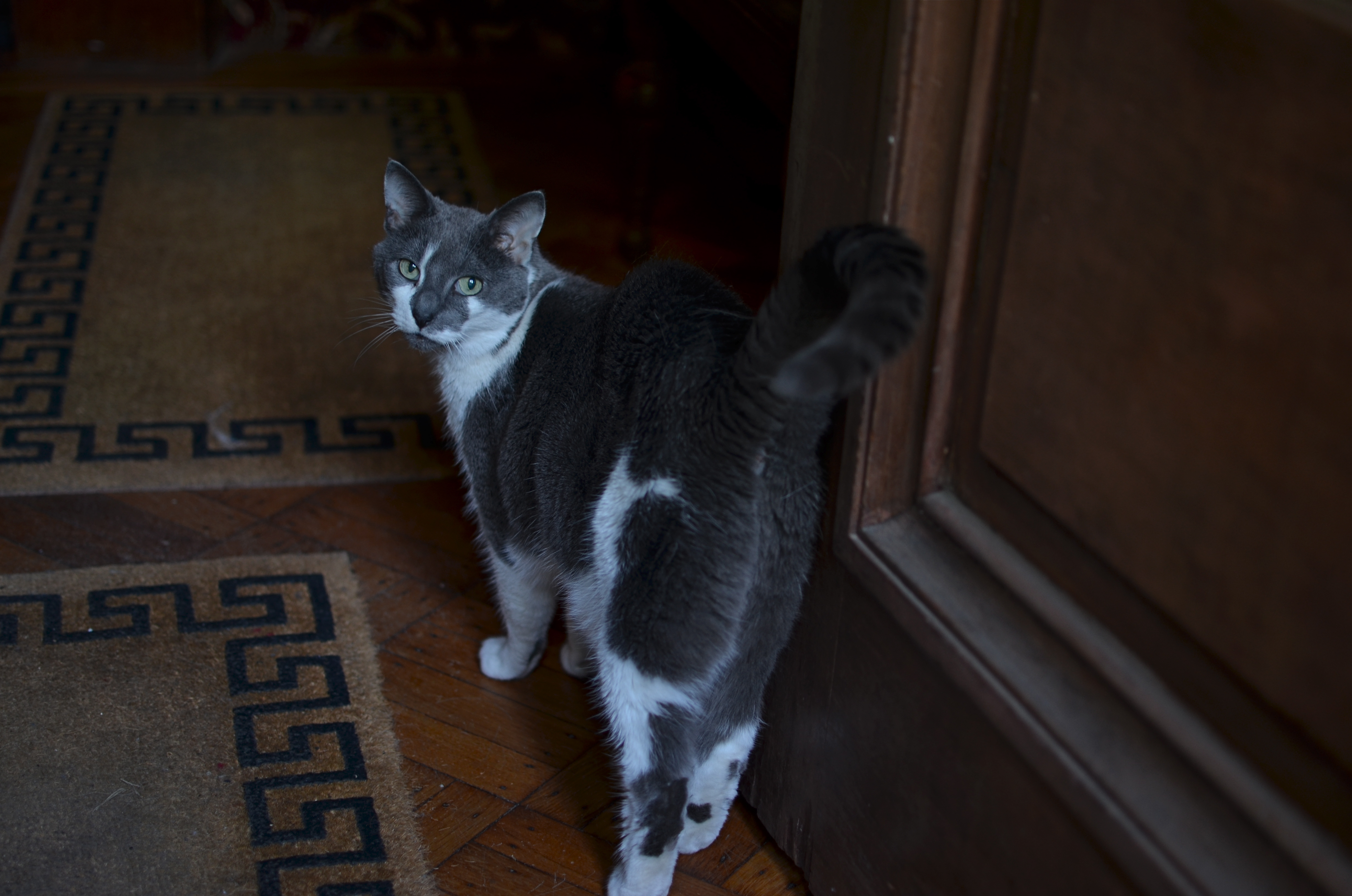I recently encountered this particular lady in a Brooklyn brownstone, a gorgeous building, but not one that is exactly flooded with light, even on a bright day. There are a million romantically wonderful places for darkness to hide inside such wonderful old residences, and any self-respecting feline will know how to take the concept of “stealth” down a whole other road. The cat in the above photo is, believe me, better at instant vaporization and re-manifestation than Batman at midnight in Gotham. She also has been the proud unofficial patrol animal for the place since Gawd knows when, so you can’t pull any cute little “chase-the-yarn-get-your-head-stuck-in-a-blanket” twaddle that litters far too much of YouTube.