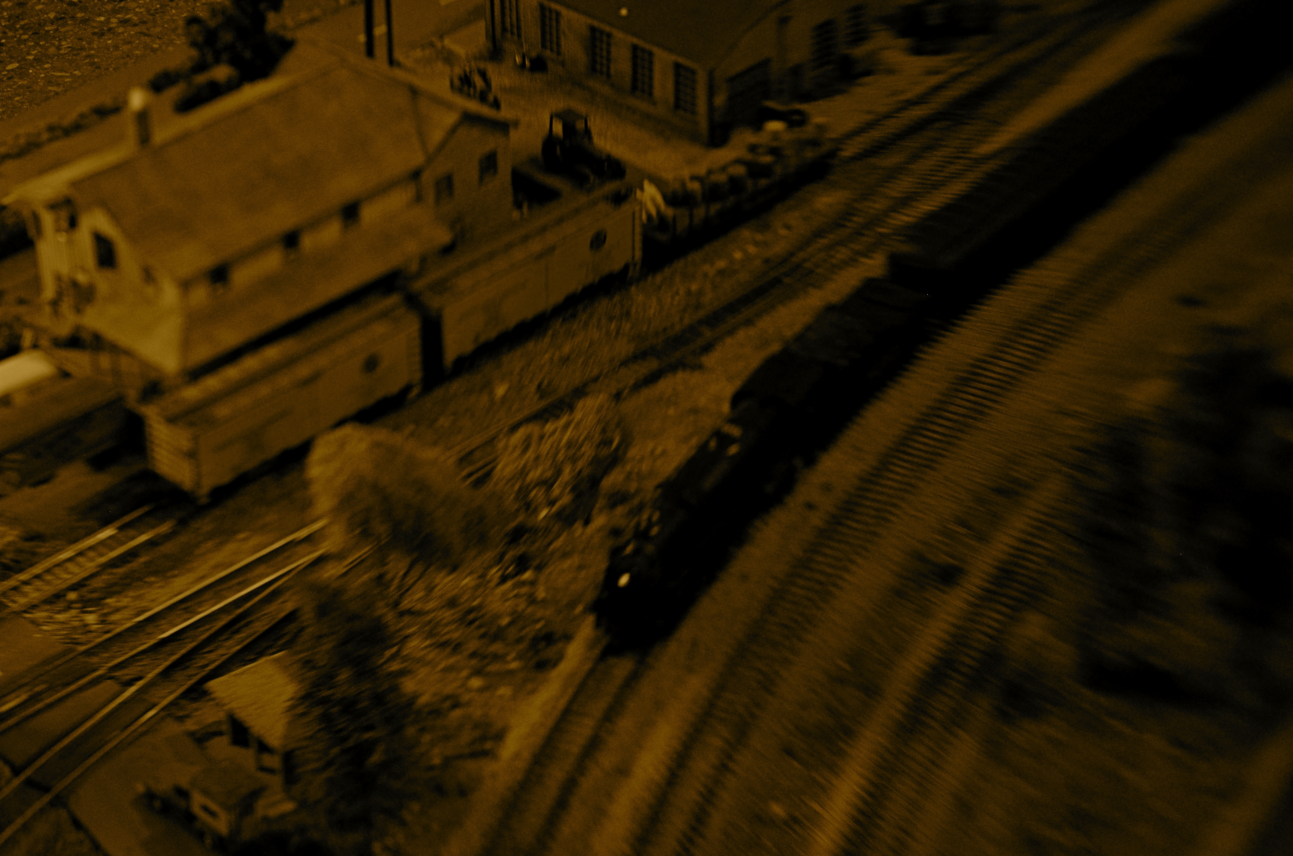 It came from a random day of practice I had undertaken with a Lensbaby, one of those effects lenses designed to give you the ability to manually throw parts of your image out of sharp focus, in fact to rotate around and create various “sweet spots” of sharpness wherever you want to. I don’t use the thing a lot, since it seems, on some level, damned silly to put defects into your pictures on purpose just to convince yourself you are, ahem, an artiste. But, all work and no play, etc. etc., so I was clicking away inside a dimly lit building at a railway museum in which a huge layout of miniature train dioramas is a regular attraction. I seemed to be going out of my way to create a picture that would normally be “three strikes and you’re out”…..that is: