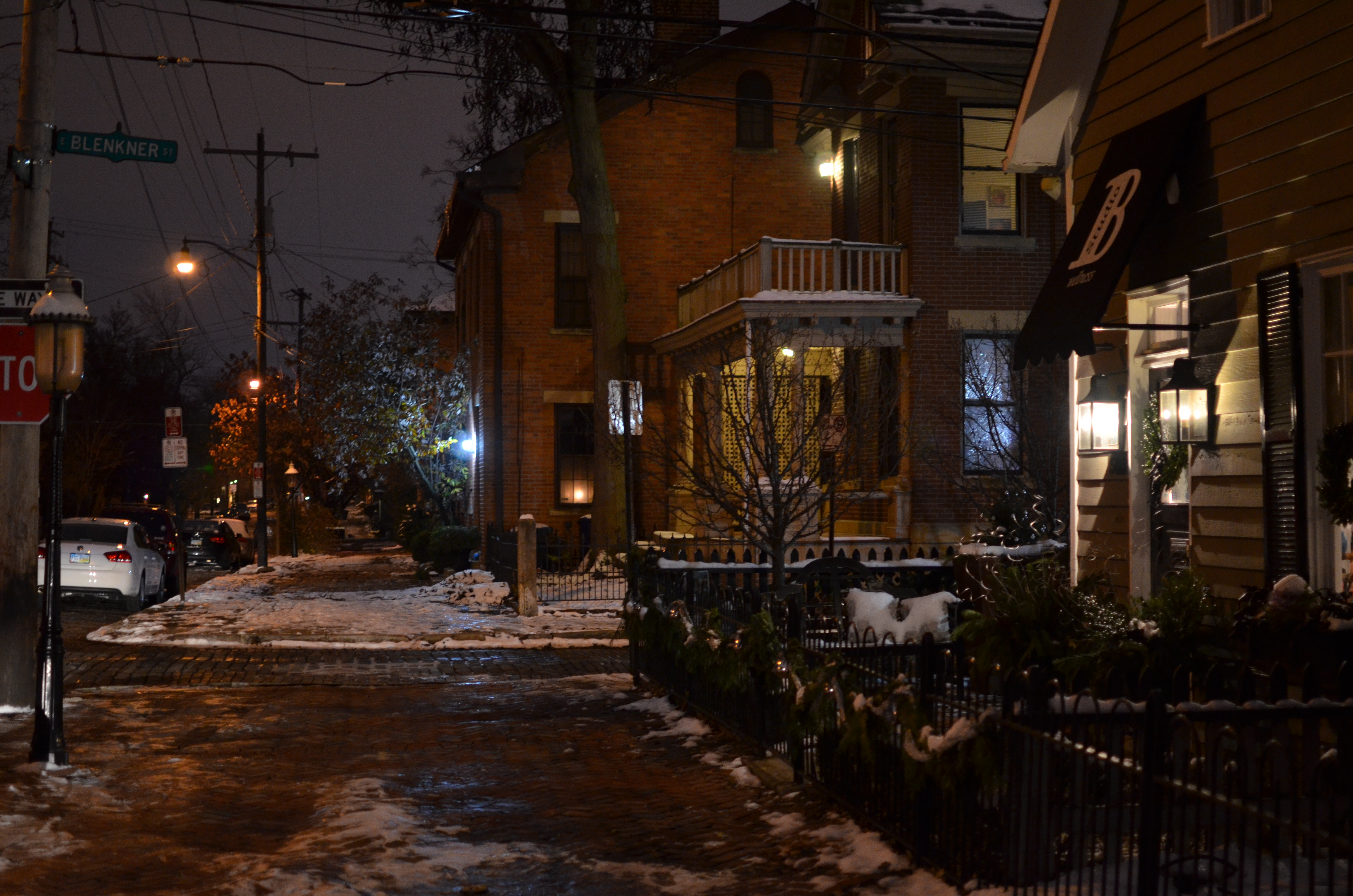 Stepping onto Blenkner Street and into history. Columbus, Ohio’s wonderful German Village district, December 2013. 1/60 sec., f/1.8, ISO 800, 35mm.