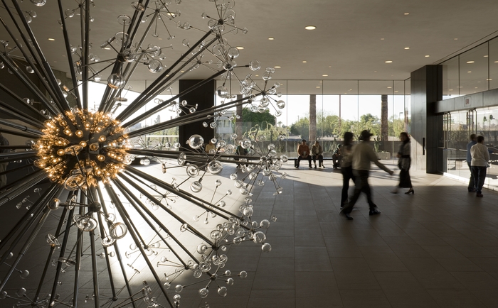 The Phoenix Art Museum greets customers with a stunning original sculpture in glass and plexi right at the entrance to its ticket lobby. A huge installation of light bulbs, mirrored surfaces and reflective discs, Josiah McIlheny’s The Last Scattering Surface resembles a brightly burning orb (planet? asteroid? dwarf star?) surrounded by jutting rods that carry the central sphere’s light along “rays” to a series of circular satellites (moons? craft? debris?) Like many examples of pure design it is both everything and nothing, that is, it is mutative based on your observation. So, in a way, as in the manner of a photographer, you are already a participant in the co-creation of this object just by looking at it. Does this mean that it’s less theif-ish to go ahead and mutate the man’s work?
