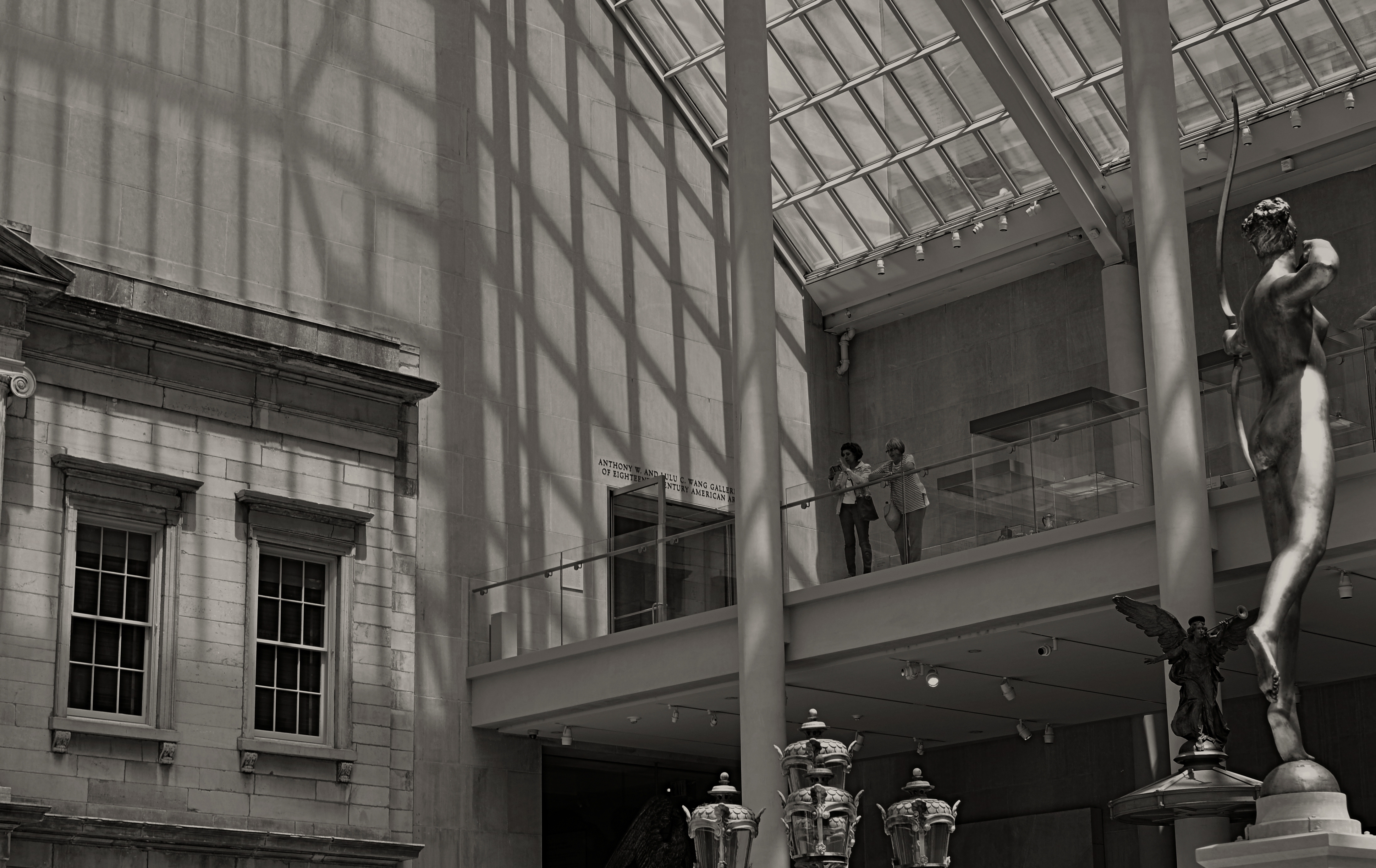 I decide that I do. Just as it’s uncertain what the couple is discussing, it’s impossible to know if she’s overhearing something intimate and juicy, or just sitting taking a rest. And I like leaving all those questions open, so, in the picture she stays. Thus, what you see here is exactly one out of one frame(s) taken for the hell of it. Nothing was changed in post-production except a conversion to monochrome. Turns out that even the possibility of budding romance can’t survive the distraction of Mrs. Gardner’s amazing legacy seen in full color, and the mystery woman is even more tantalizing in B&W. Easy call.
