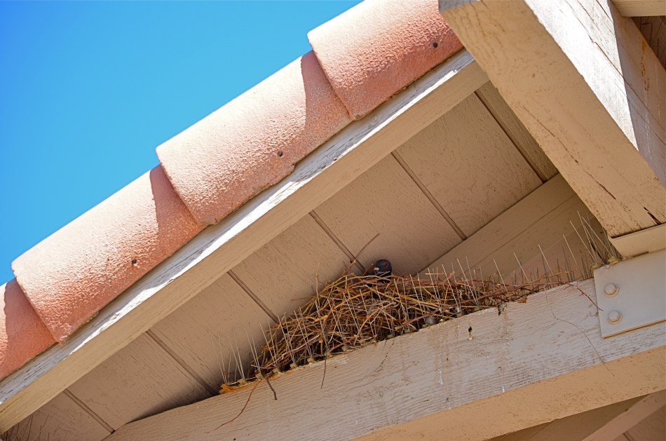 Start by installing tiny metal spikes in the cross beams right over the entrance to your front door. You’ve seen them, those steely porcupine quills designed to bar entry to all the nooks and crannies where birds love to assemble to conduct aerial assault on your sidewalks. Spikes go up, birds get packing, no cruelty, no pavement poo, everyone’s a winner, right?
