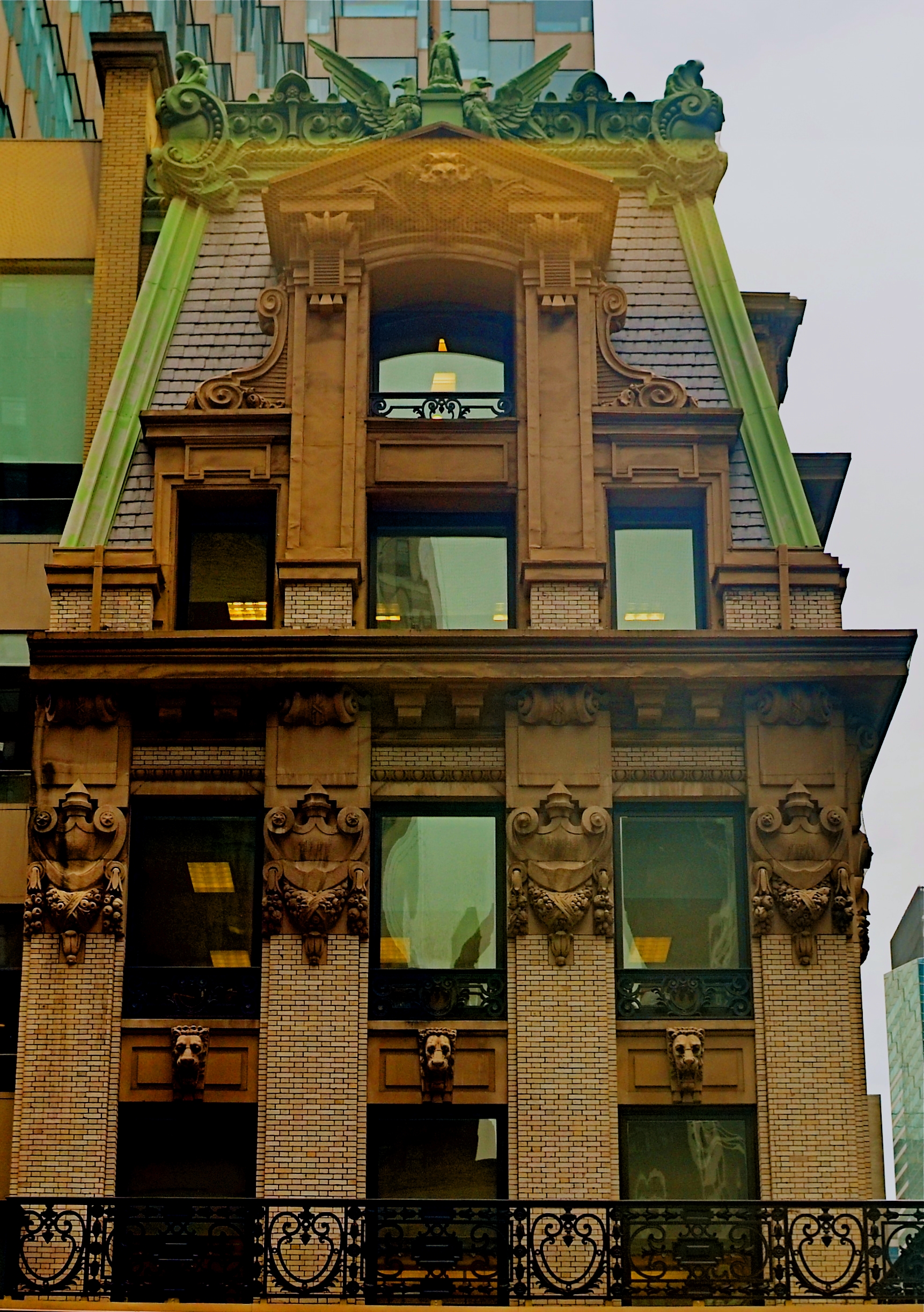 As one example, the building shown here, 452 Fifth Avenue in New York City, presents a magnificent face to anyone lucky enough to be in a position to crane their neck just a few extra floors above street level. Built in 1902, when a ten-story building was still a big deal in Manhattan, the Knox Building, named for Edmund Knox and the hat factory that made him a millionaire, was an anomaly from the start. Knox decided not to engage just any architect, but to hire John Hemenway Duncan, the man who had designed both the memorial arch at Brooklyn’s Grand Army Plaza and Grant’s Tomb, an act slightly akin to hiring Frank Lloyd Wright to build you a 7-11. Decades later, however, having survived years of attempts to raze it, the Knox landed on the National Registry, and in the 1980’s, got a new glass tower wrapped around it to make it the crown jewel of a major midtown banking complex. If one of Mr. Knox’ hats were still available, giving it a tip would be an apt gesture of respect.
