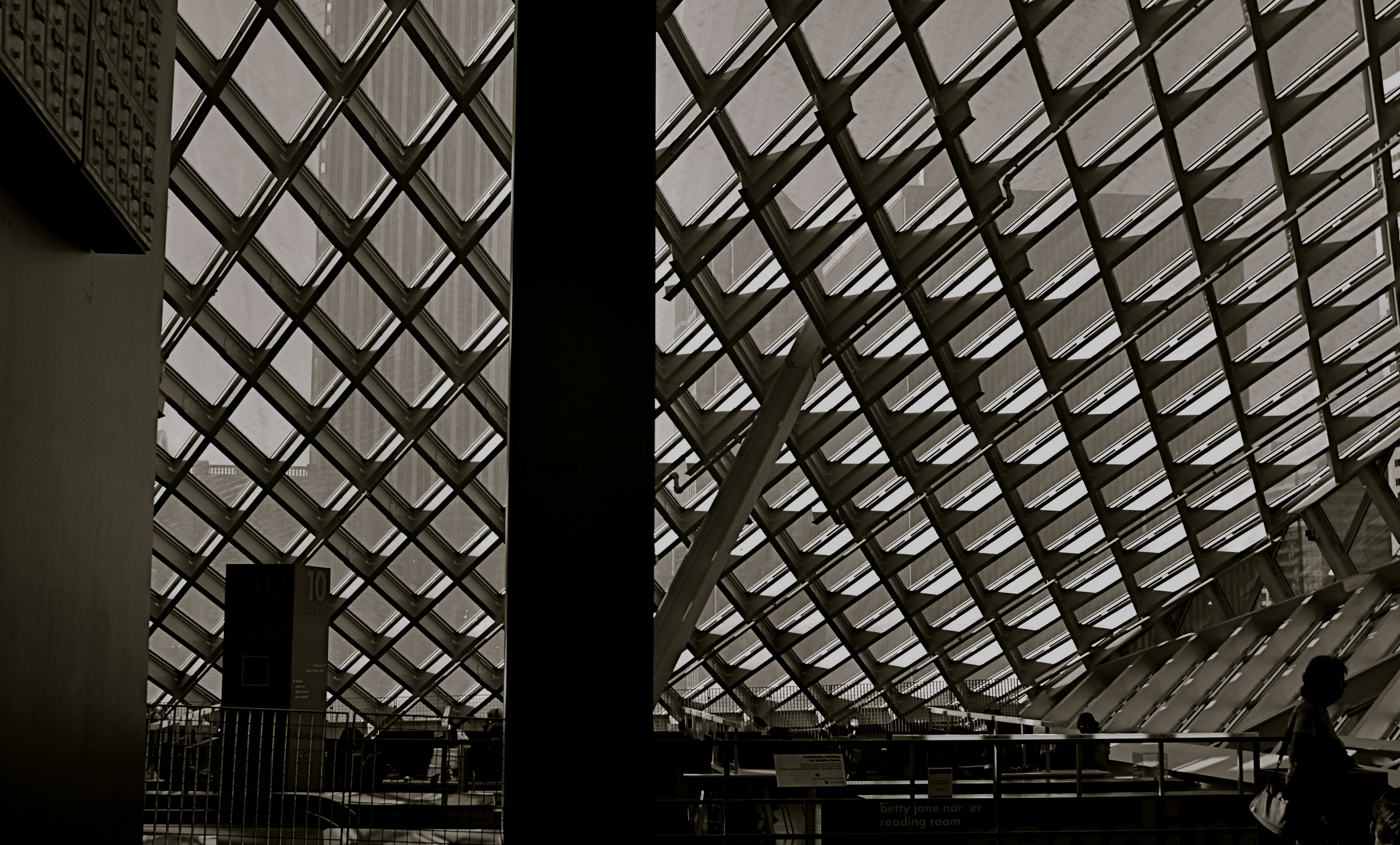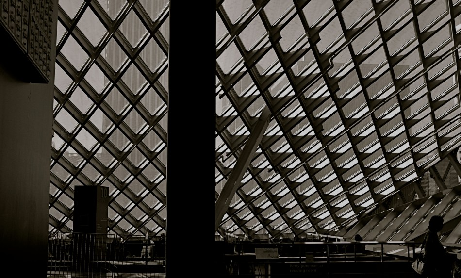 In the above picture, a human silhouette against the massive ceiling grid provides the basic context of scale, and defines the locale (a library) as a space where human activity takes place. The figure thus says how big the place is and what it is for, along with any other ancillary associations touched off in the viewer’s mind. Would the picture “work” without the figure? Certainly. The terms of engagement would just be different, that’s all.