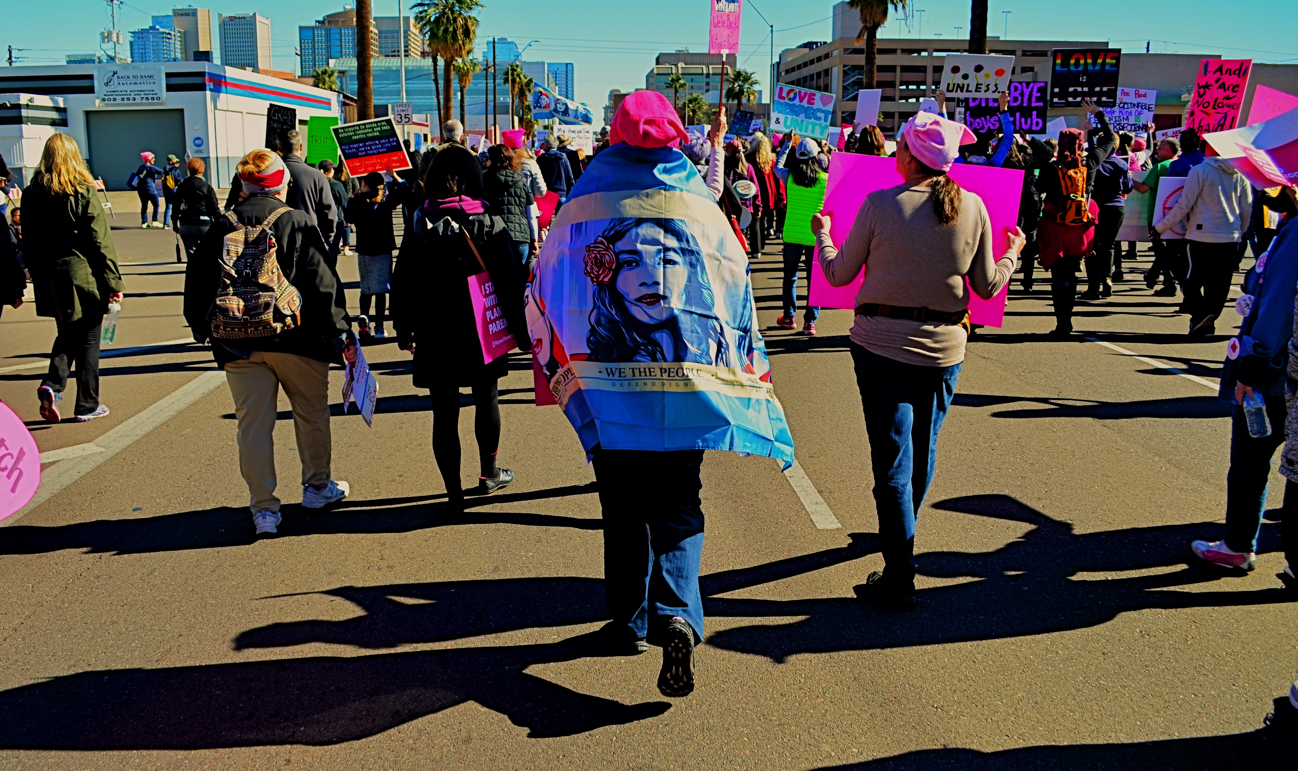 In this context, I didn’t need to see the actual expressions of the marchers: there was enough information in their body language, especially if I composed to place the woman at the center of the shot, as if she were the leader. That was enough. The actual march boasted thousands, but I didn’t need to show them all. The essence of everyone’s intentions could be shown by the assemblage of small parts.