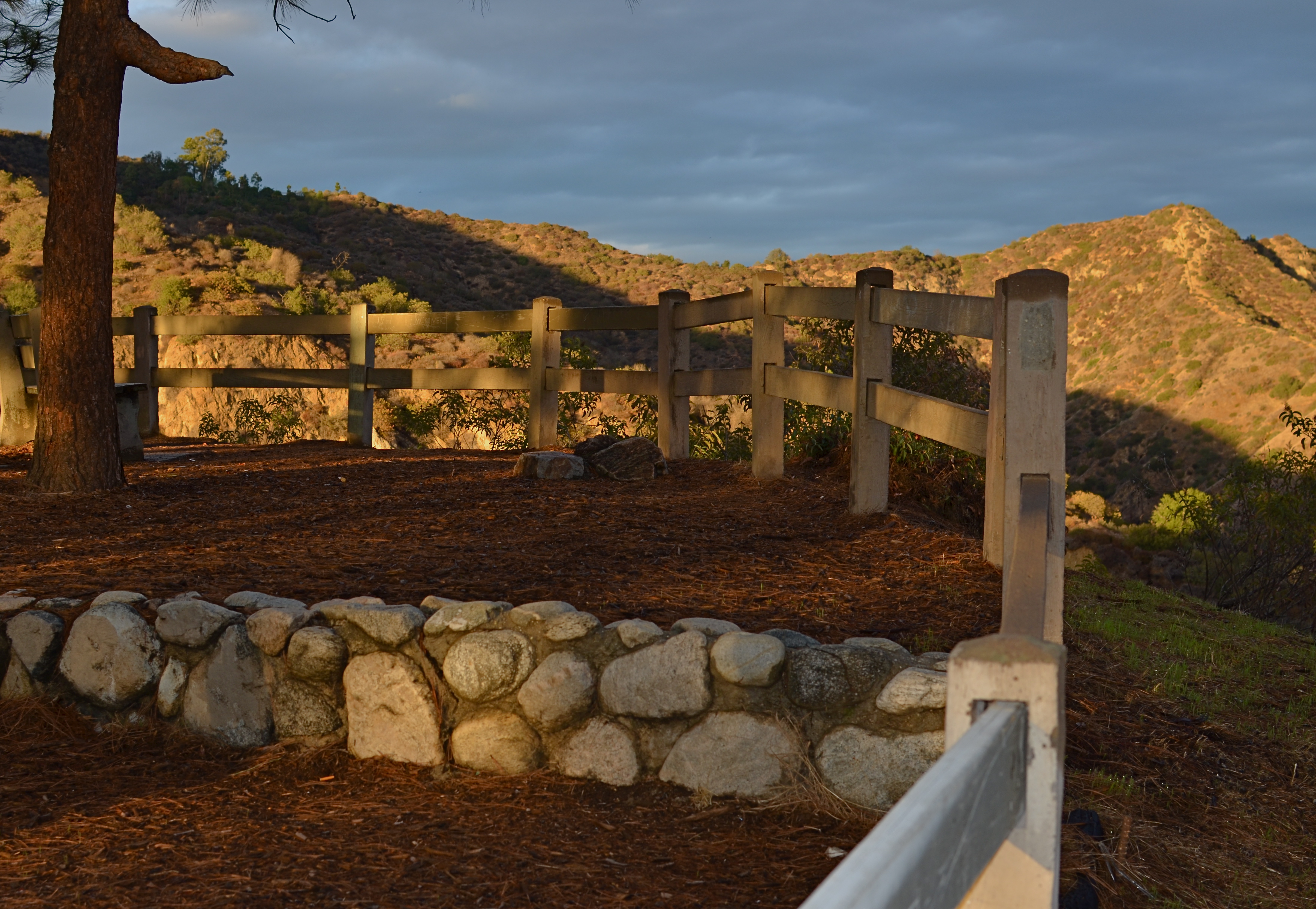 During a recent trip to the high walking paths that crown Griffith Park in Los Angeles, I saw the trees and hills, at near sunset, form the perfect radiated glow of one of Parrish’s dusks. Timing was crucial: I was almost too late to catch the full effect, as shadows were lengthening and the overhanging tree near my cliffside lookout were beginning to get too shadowy. I hoped tha,t by stepping back just beyond the effective range of my on-board flash, I could fill in the front of the fence, allowing the light to decay and darken as it went back toward the tree. Too close and it would be a total blowout. Too far back, and everything near at hand would be too dark to complement the color of the sky and the hills.