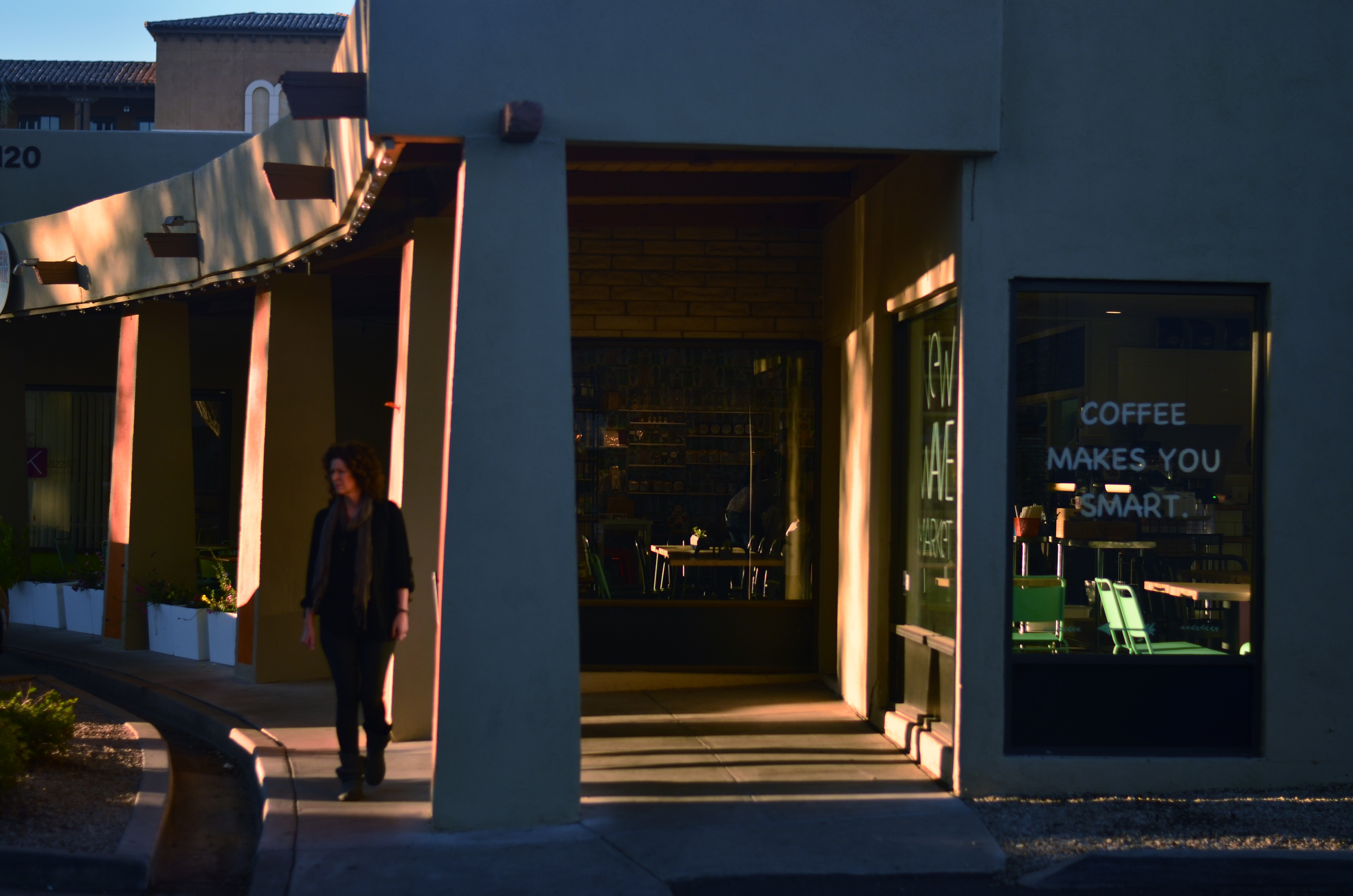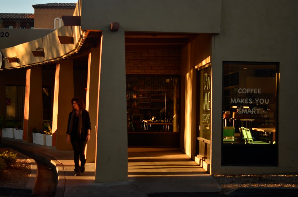 First, it was taken during the so-called “golden hour”, just before sunset, in late fall in Arizona. That guarantees at least one boost of the building’s native intensity. The next factor is the camera’s own color settings, which are set to “vibrant.” Level three comes from a polarizing filter, which is juicing the sky from its hazy southwestern “normal” to a deep blue. For the fourth element, I am also adding a second filtering component by shooting through a heavily tinted car window (there’s no other kind in Arizona), which presents here as the gradation of sky from blue at the top of the frame to a near aqua near the bottom. And finally, I am way under-exposing the shot at 1/320, deepening the colors yet one more time.
