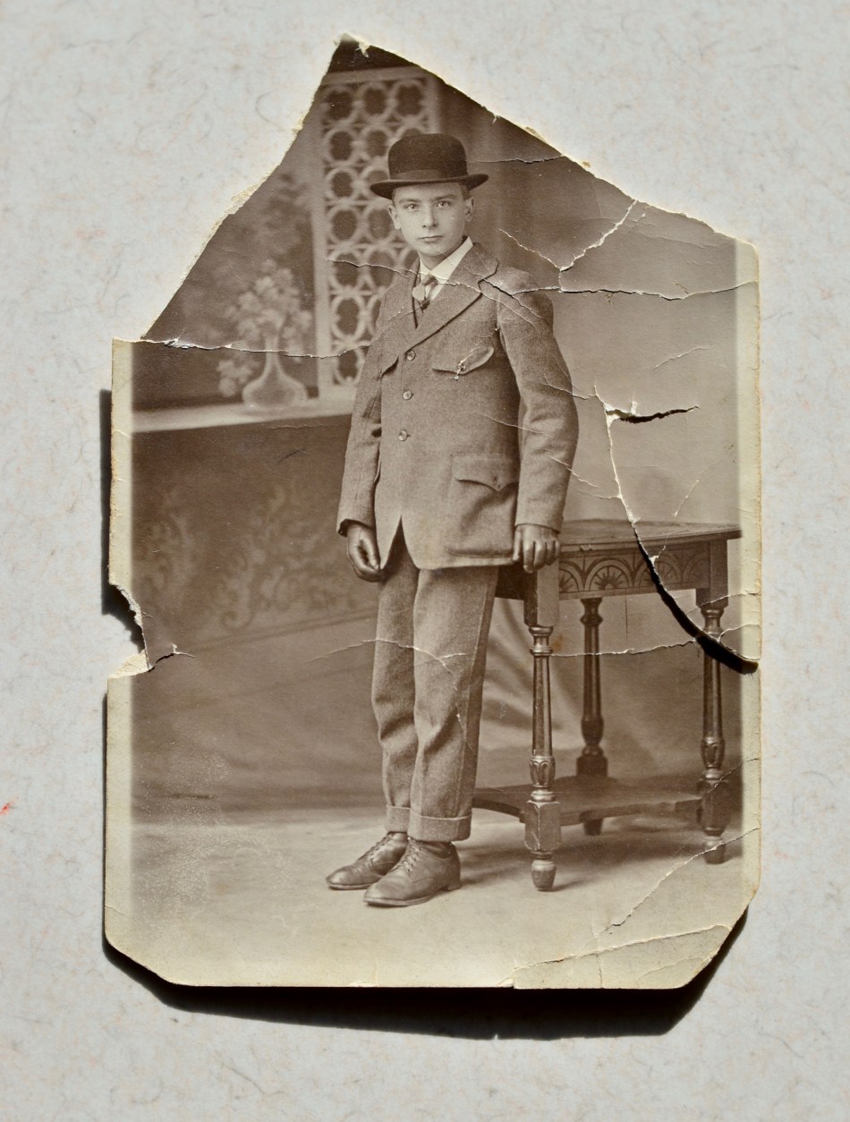 The photograph is formal, a studio portrait with someone else’s furniture and carpet suppled as homey props. His gaze is intense…too serious for a young man, some might think. And yet, of course, he will need all the determination that gaze implies to book passage, very soon, on the ship Mauritania (the Lusitania’s sister ship) and enter New York City through the thresher of Ellis Island, taking a train into the great midwest, to Lorraine, Ohio, where an uncle has vouched for his industry and loyalty. He will stay in his new country for the rest of his natural life.