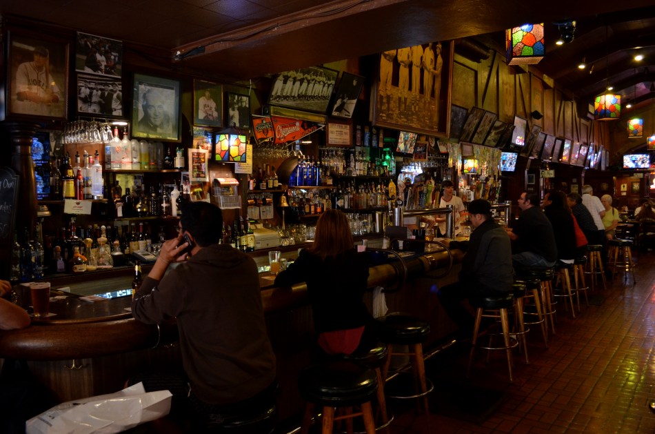 Lefty O’Doul’s bar, near Union Square in San Francisco. Lovely place, great grub, but a dark cavern where light goes to die. Modern DSLRs allow this to be a handheld shot with a minimum of noise: 1/20 sec., 5/5, ISO 640, 18mm.