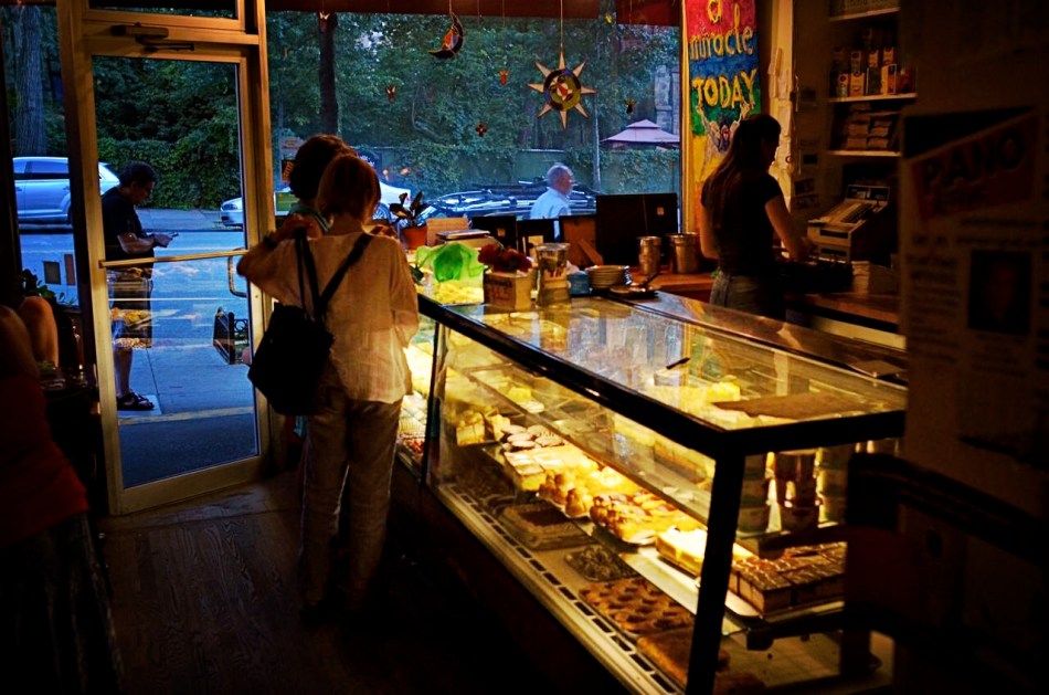 Most places of business naturally react to the daily dying of exterior light by turning on their interior lamps. Sun goes down, lights go up. But occasionally, as in this wondrous and quirky little bakery cafe in Morningside Heights in Manhattan, the comfort food was accompanied by what could easily be termed comfort light. The lights inside the pastry case, at least during this particular evening, were allowed to serve as the only illumination for the entire inside of the store, lending the customers around the counter the warm intimacy of a shared fireplace.