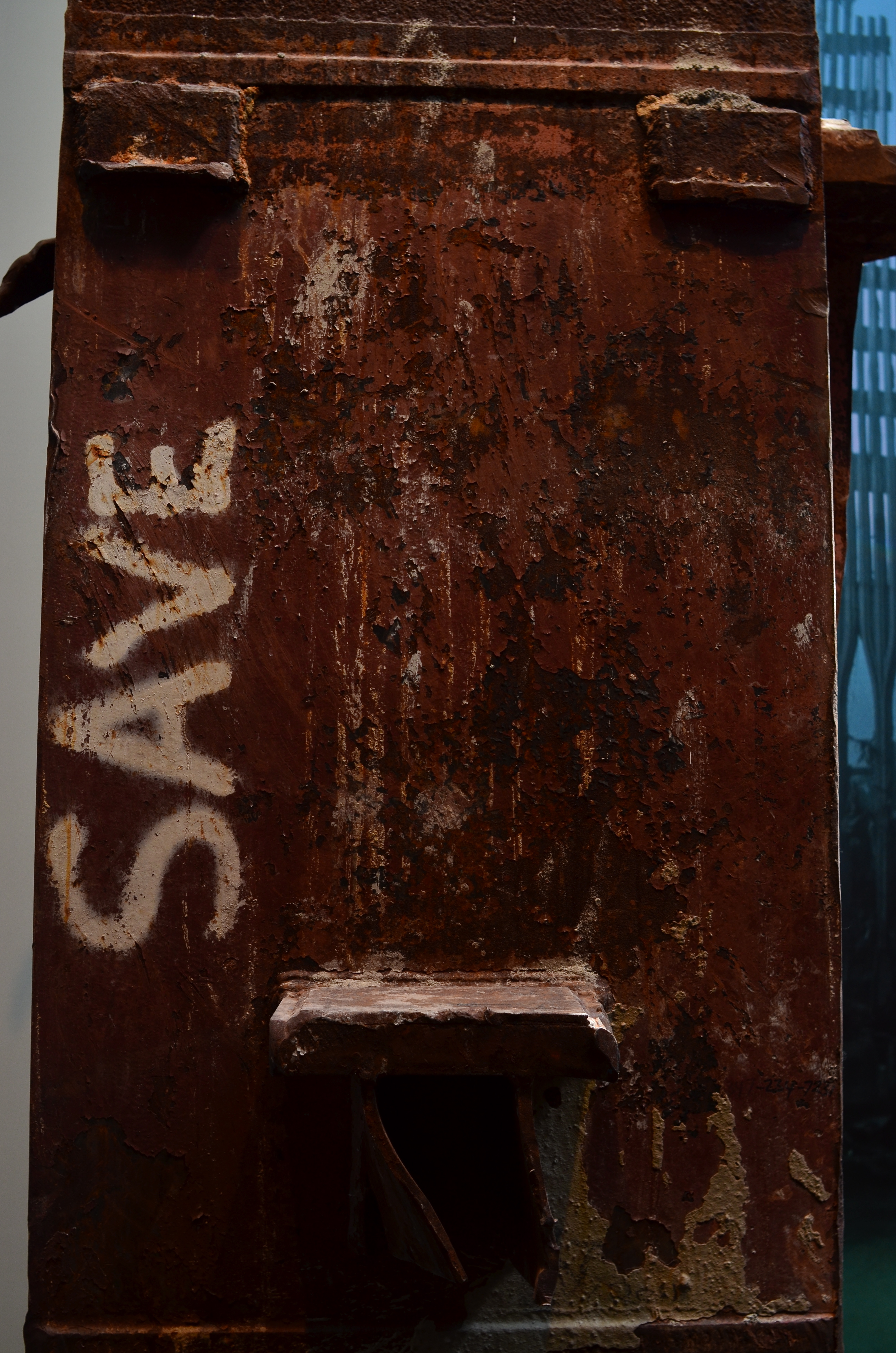 No, the real photographic opportunities are in the dark, cavernous spaces under the surface of the street, dim caves that make you feel as if you yourself, are, for a moment, trapped, running out of light and time. The enormous foundation known as the slurry wall, which, in surviving the titanic forces of the towers’ collapse, kept the Hudson River from flooding all of lower Manhattan. The rusted girder that, like a day-glo-autographed tombstone, bears the signature of every working company of first responders that slaved away at Ground Zero, first as rescuers, next as salvagers, always as heroes.