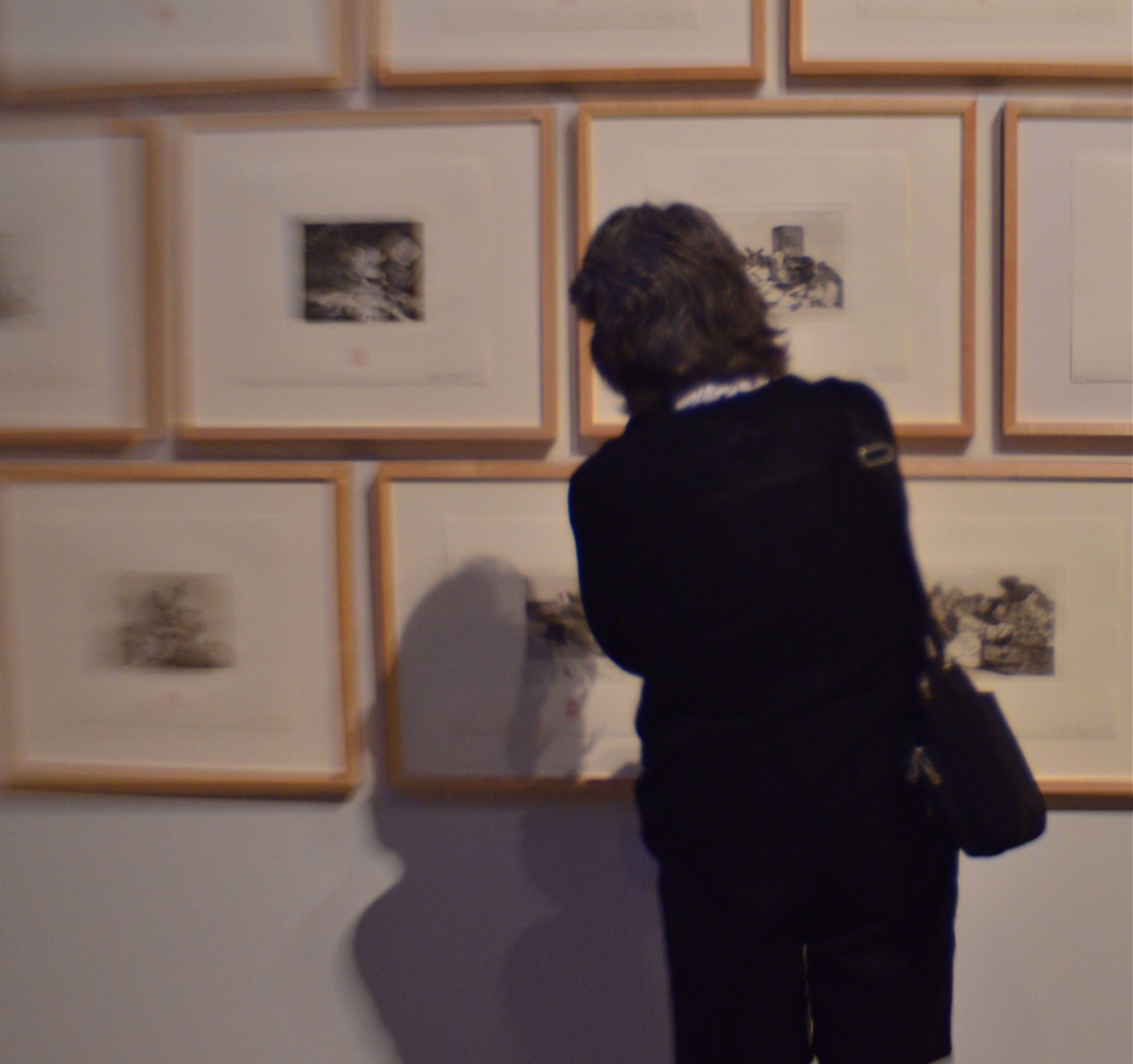 There is also a secondary, and fairly endless, source of photographic sketch work to be had in the people who visit public art spaces. The body language of their contemplative study of the artwork is a kind of mute ballet all its own, and no two patterns are alike. Watching the people who watch the art thus becomes a spectator sport of sorts, one which works to the advantage of the candid shooter, since people are more immersed in the paintings and thus a little less aware of themselves as regards the photographer. That leads to what I call “bodily candor”, a more relaxed quality in how they occupy their personal space.